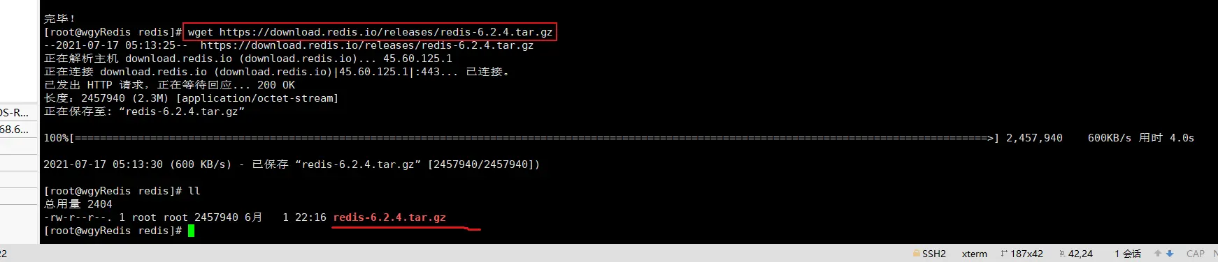 第一步:通过 【wget https://download.redis.io/releases/redis-6.2.4.tar.gz】 下载redis最新的源代码安装包;