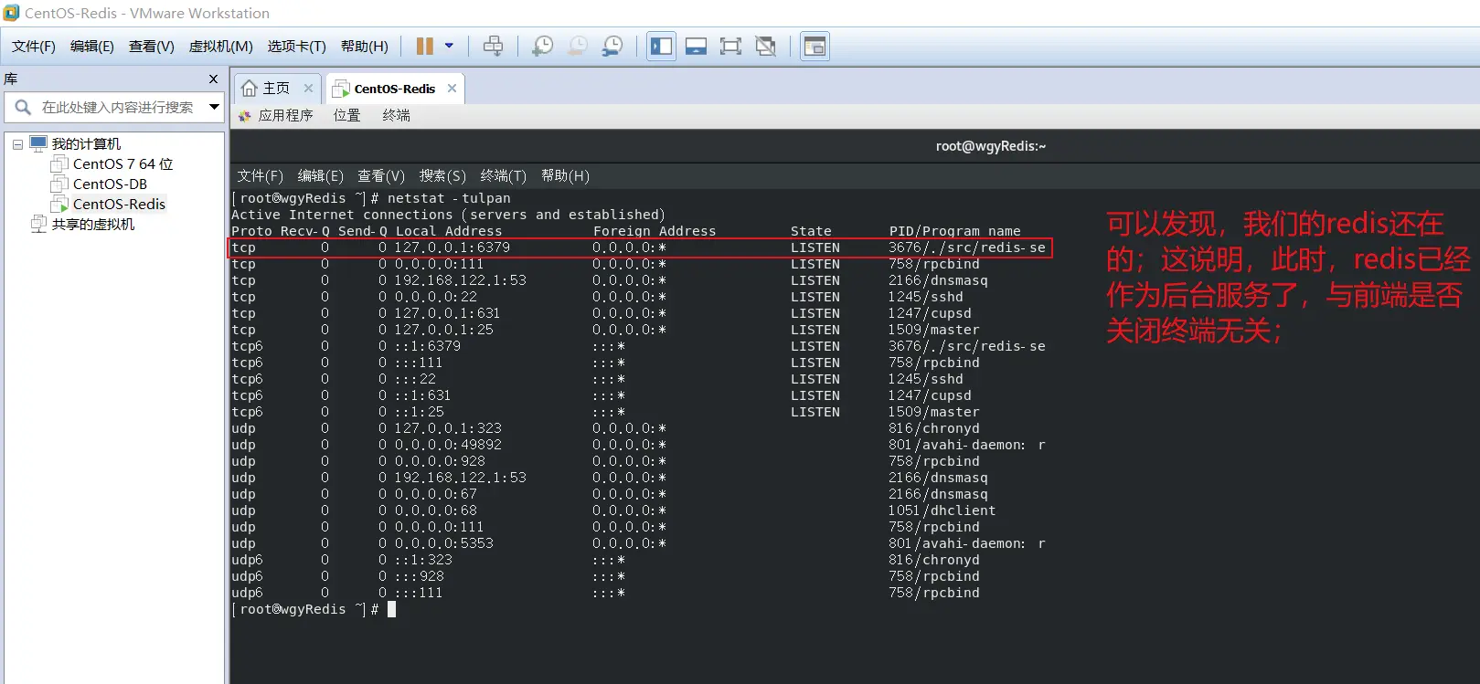 此时,只要centos系统在运行,那么redis就会一直提供服务;然后,经过实测,关掉这个虚拟机后,redis服务自然也会被关闭。