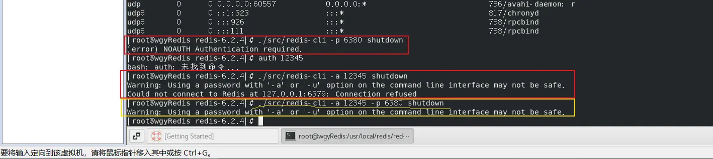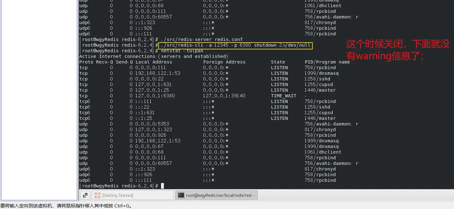 可以使用【./src/redis-cli -a 12345 -p 6380 shutdown 2/dev/null】去关闭redis服务; 此时关闭时就没有warning提示信息了;