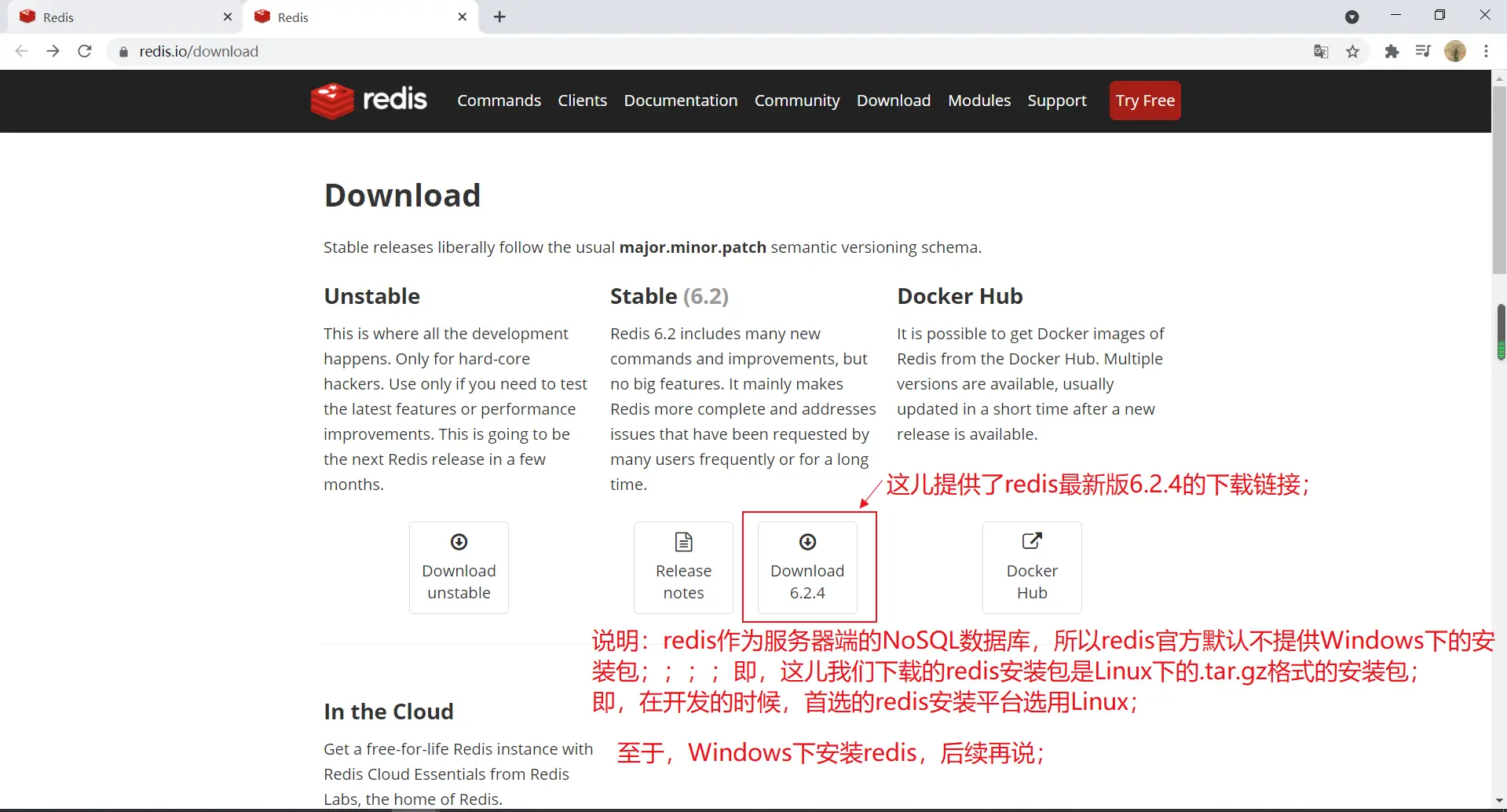 PS:这个版本已经太老了,在生产环境中不建议使用;但是,作为学习,还是可以看看的;(redis从3版本到5版本,redis的命令是没有变化的)