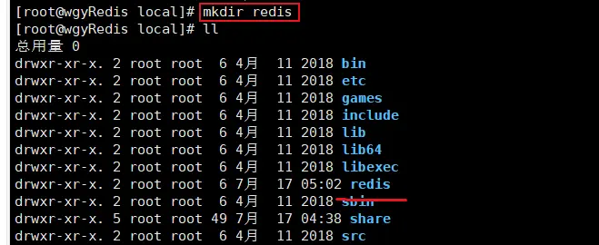 首先,使用 【mkdir redis】 命令,在/usr/local目录下,创建redis目录;