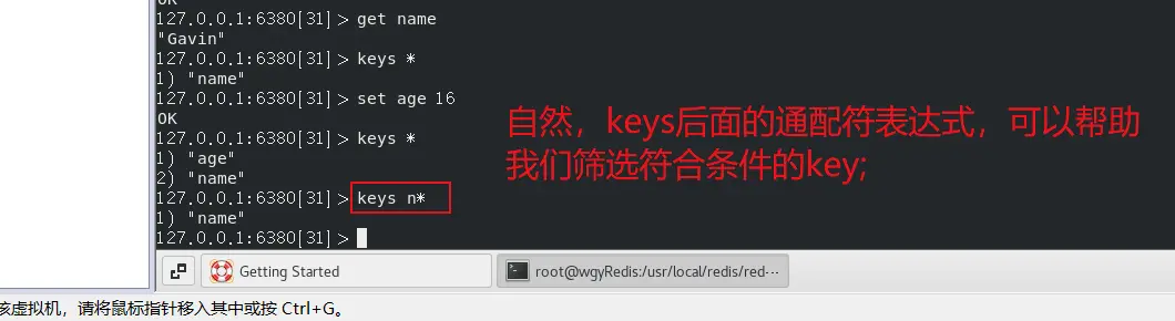 (4) keys命令:使用一个通配符表达式,查询当前数据库中所有满足通配符表达式要求的key;