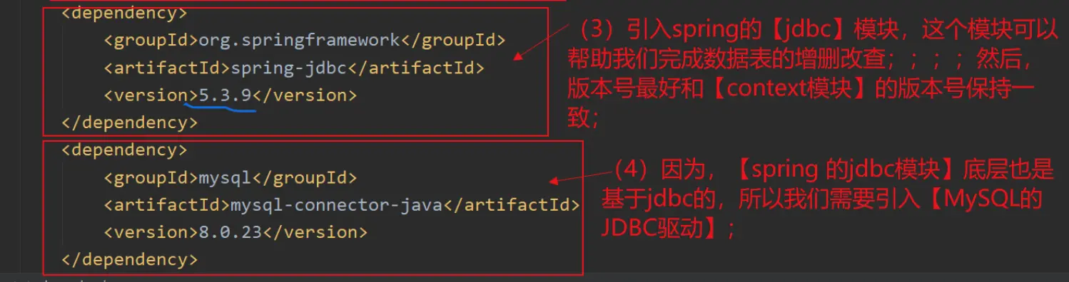 ● 只是用Spring JDBC时,需要引入【spring-jdbc的依赖:spring-jdbc】和【JDBC的依赖:mysql-connector-java】;【Mybatis】,【Spring JDBC】这些操作数据库的框架都是基于jdbc的封装;所以,这儿也需要在pom中引入jdbc依赖;