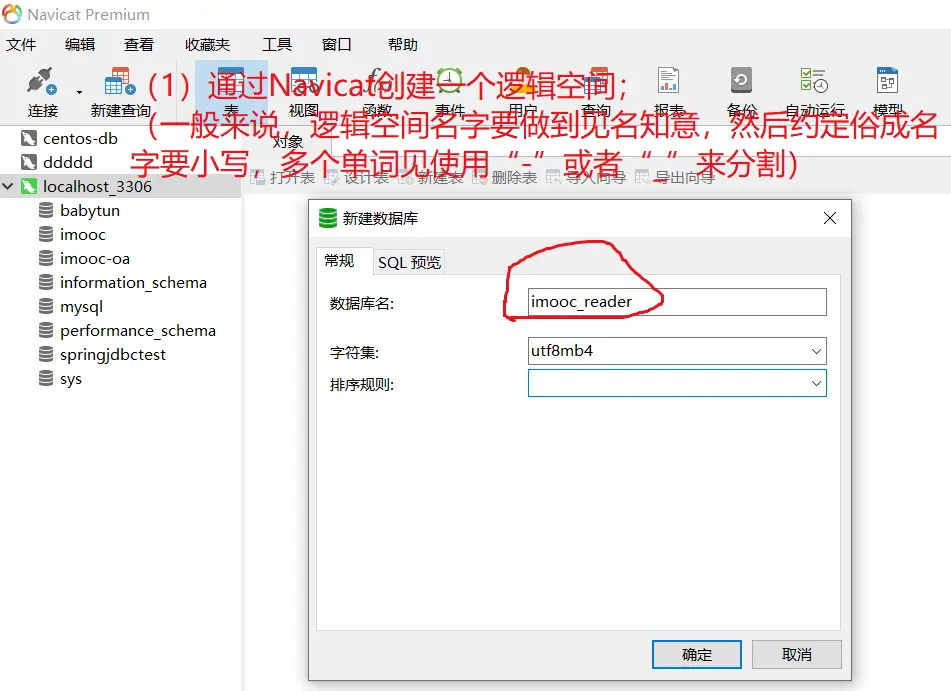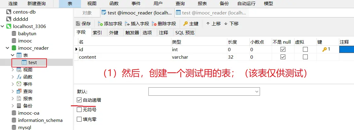 前期准备:Spring与Mybatis整合的过程中,我们要测试,既然要测试,肯定需要用到数据库,所以为此我们先创建逻辑空间imooc_reader,然后创建了一个测试用的表test表;