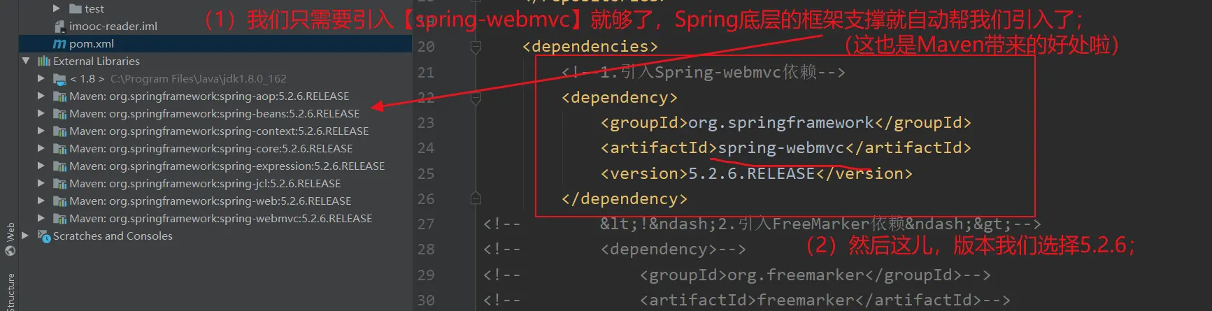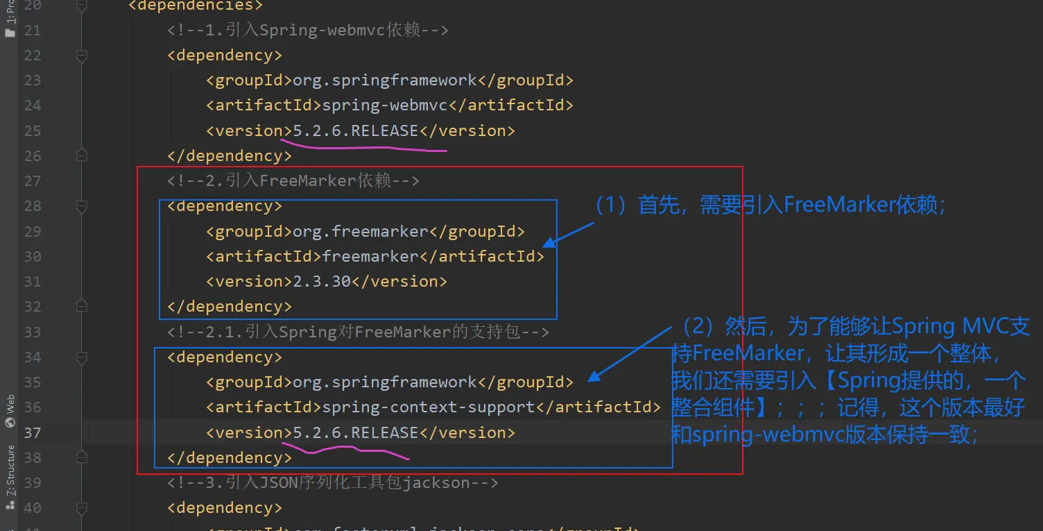 1.第一步:依赖spring-webmvc:在pom.xml中,引入【spring-webmvc】,【FreeMarker】,【jackson】依赖;