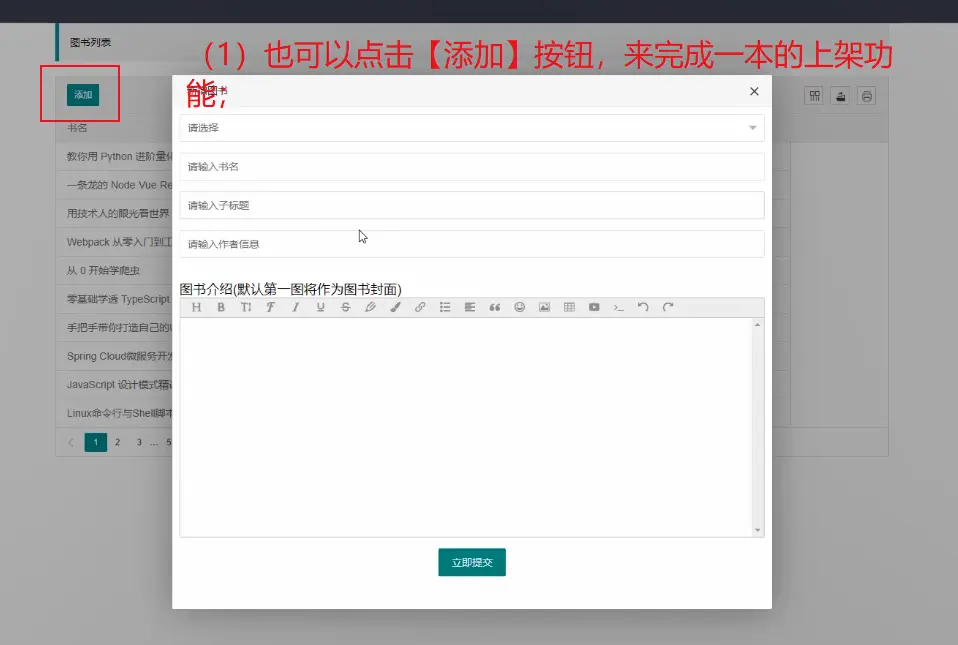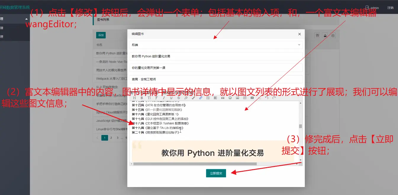 (4) 因为书评内容包括图文资料,为了能够在线编辑这些图文信息,引入了富文本编辑器wangEditor;