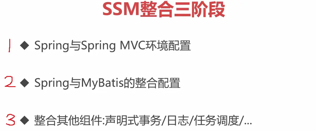 (3) 第三阶段:整合其他组件:在项目实际实际运行时候,还会涉及到日志、任务调度、声明式事务等其他技术;我们也需要将这些组件和技术,有机的整合到项目的底层环境中;