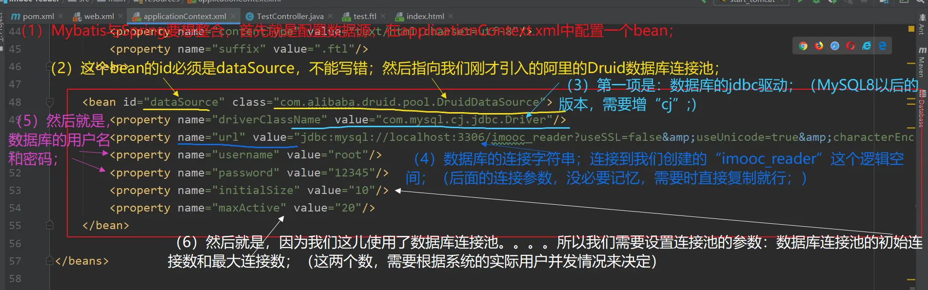 (1) 明显可以感觉到,在【SSM项目中配置数据库连接池】和【以前在JDBC中,或者在Mybatis中,配置数据库连接池】的具体操作是由差异的;(但是,其背后的基本常识是一样的)(SSM项目中配置更简单,能够体会到SSM框架背后帮了我们很多,也能感受到越是高级的框架,我们越省心);