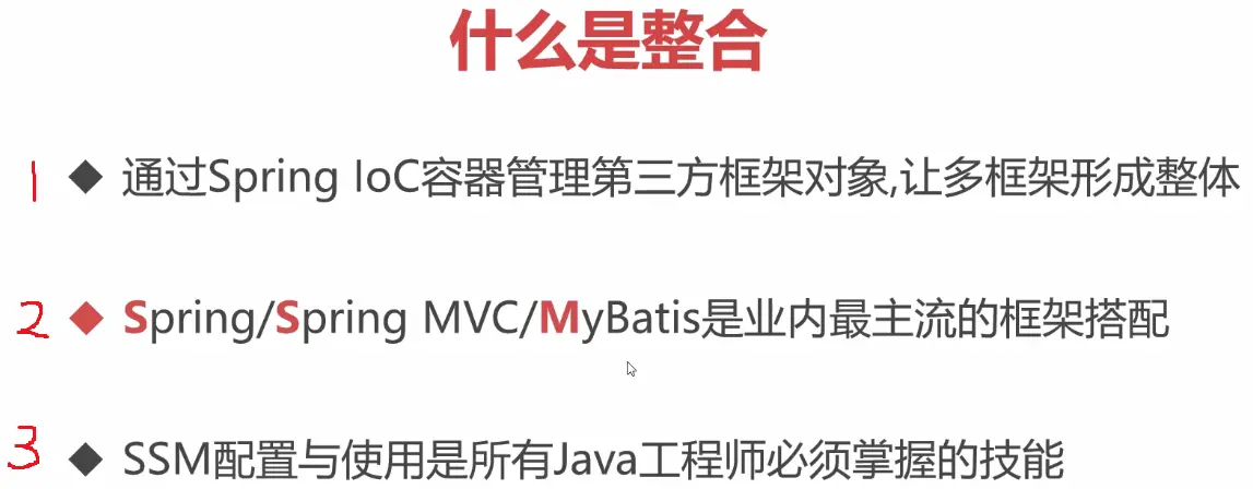 比如,一个项目会同时用到Mybatis,Spring,此时,我们就需要考虑把这些不同的框架构建成一个整体;否则,因为不同的框架有不同的配置文件和配置信息,那么在程序开发和项目上线后,会很难维护;如,如果这些框架没有整合,那么其他框架(如Mybatis)就享受不到【Spring提供的IoC、声明式事务、AOP等扩展特性】;