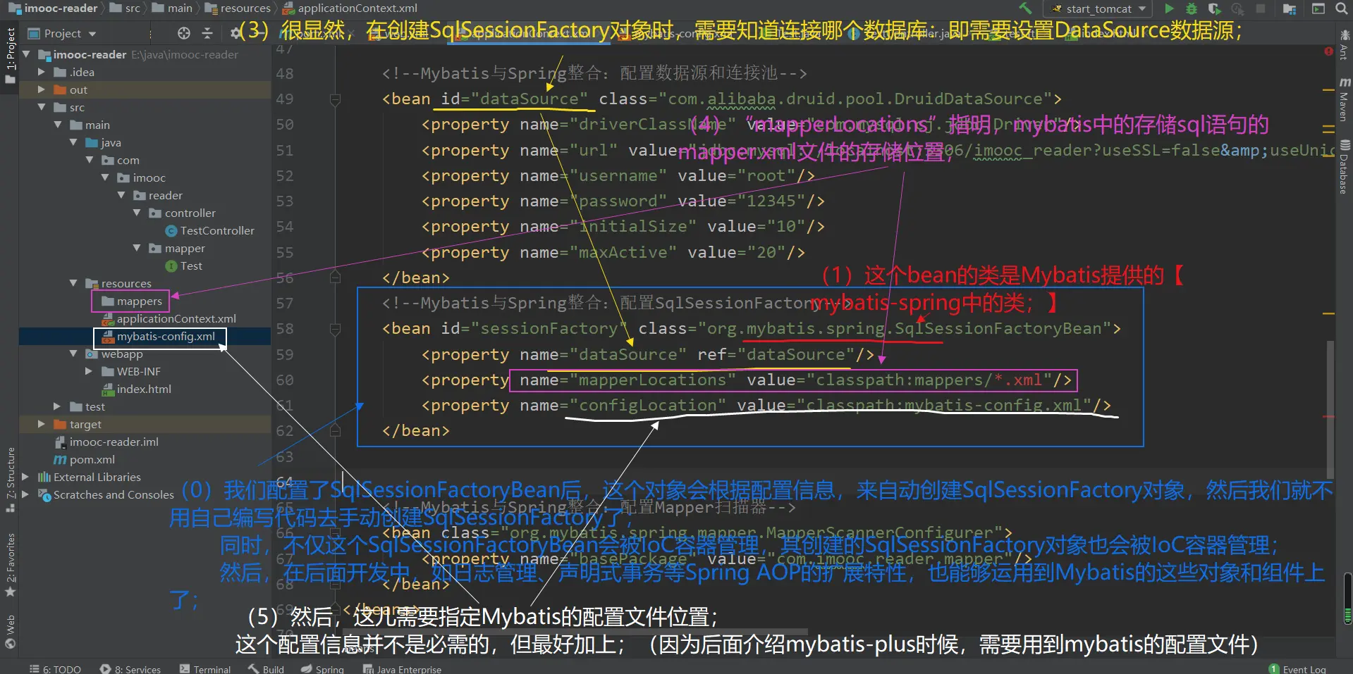 通过这个步骤,能够看出:applicationContext.xml文件是Spring的,然后数据源对象在这个Spring的配置文件中配置,能够感受到Mybatis为了和Spring整合,而所做的配合和努力。