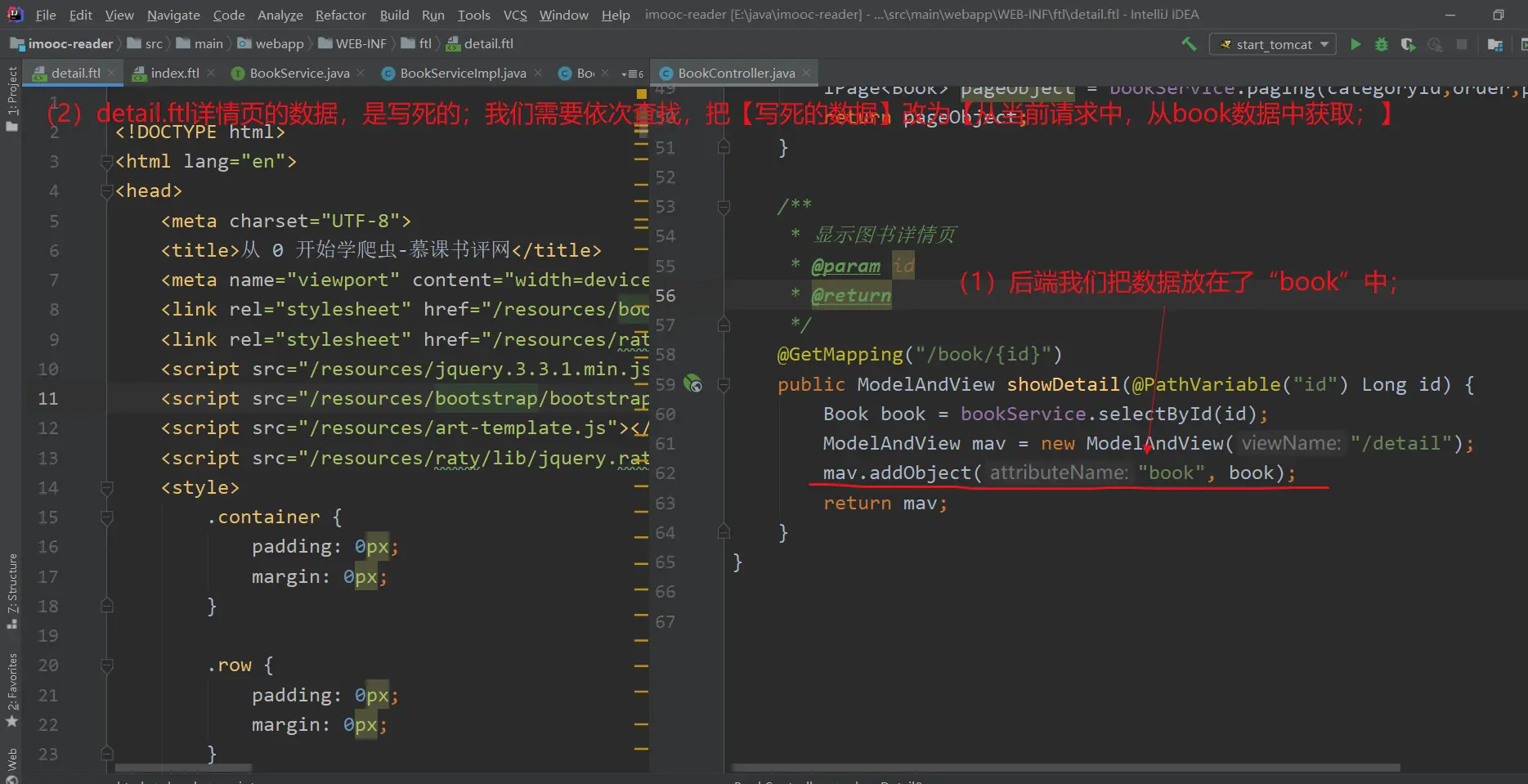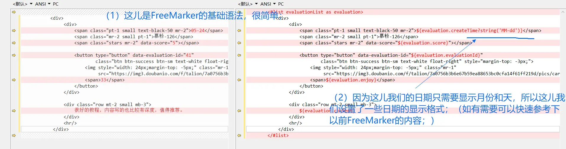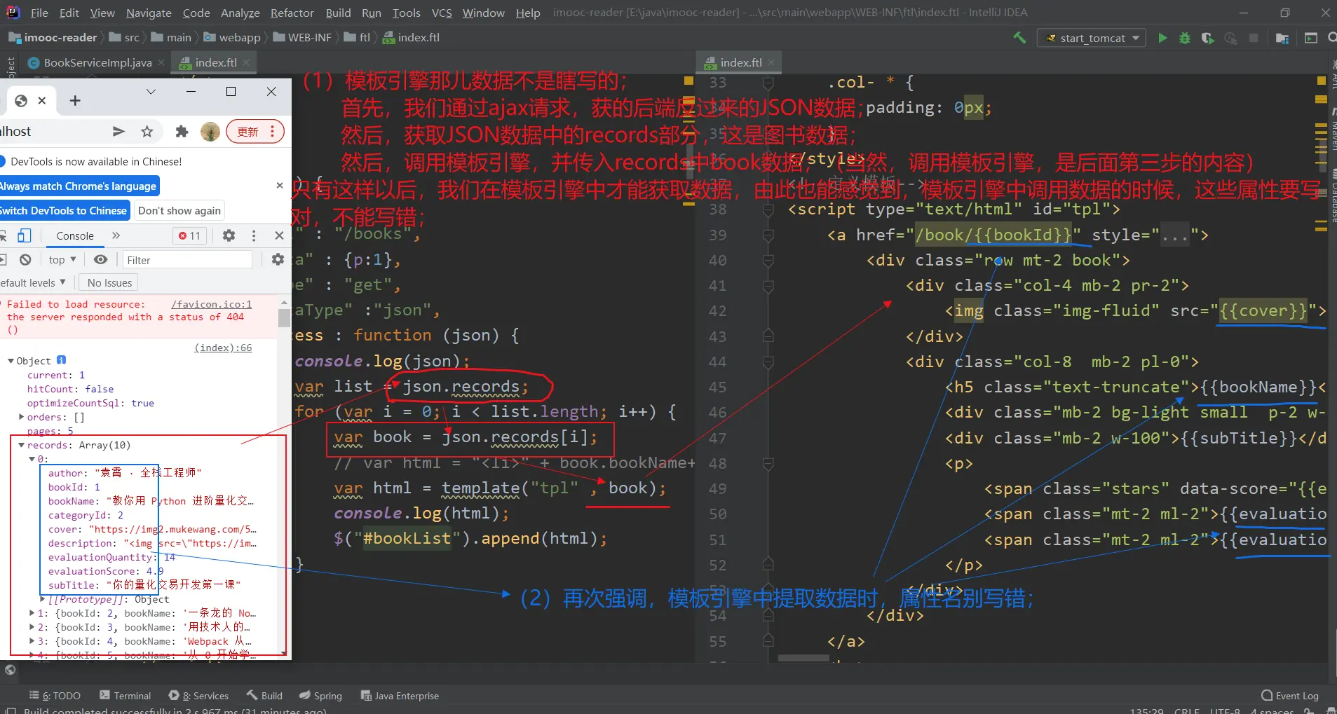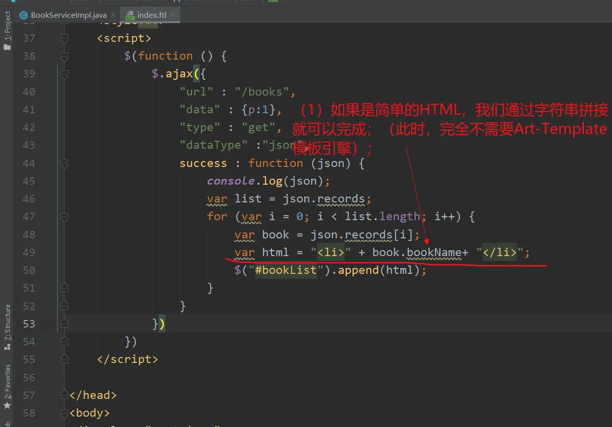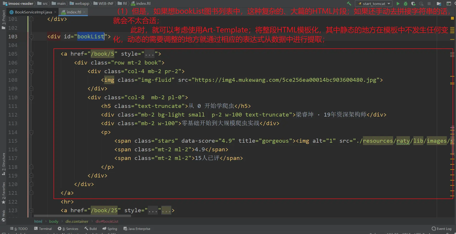● 问题: 在【JS模板引擎Art-Template入门】中,我们开发首页时,首页的图书信息,我们是这样做的:【前提,我们首先设置一个<div>容器,把这个容器作为盛放图书信息的容器】→【首先,当后端的图书数据过来后,这些数据是List】→【遍历这些List,每获取一条图书数据,就通过Art-Template定义模板,把这条数据渲成HTML片段】→【然后,把这端HTML,追加到那个容器中】;:为什么在前面显示图书信息这篇博客中,我们这样做;而,在这儿,我们显示短评信息时,我们直接<#list>遍历显示就行了?