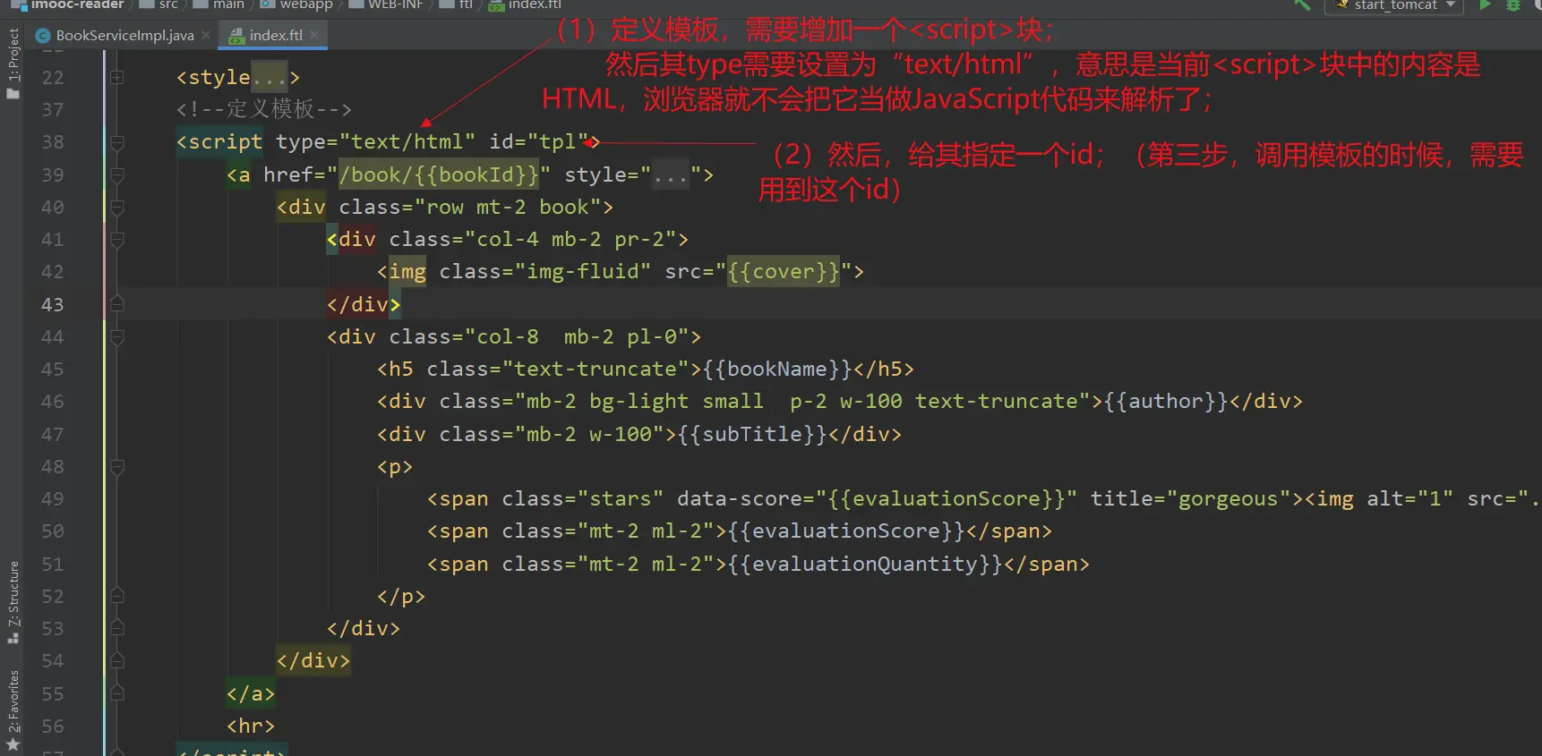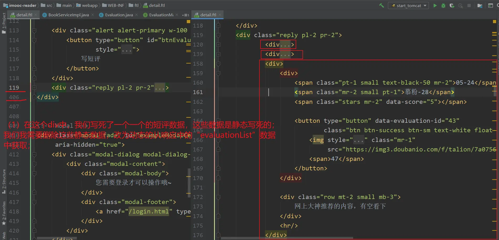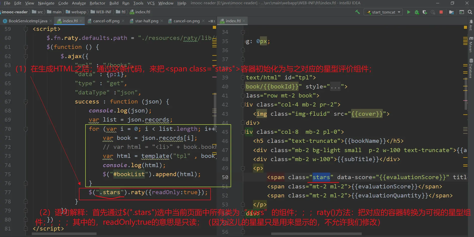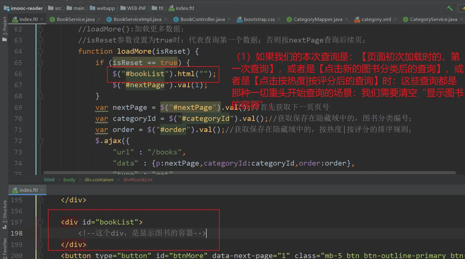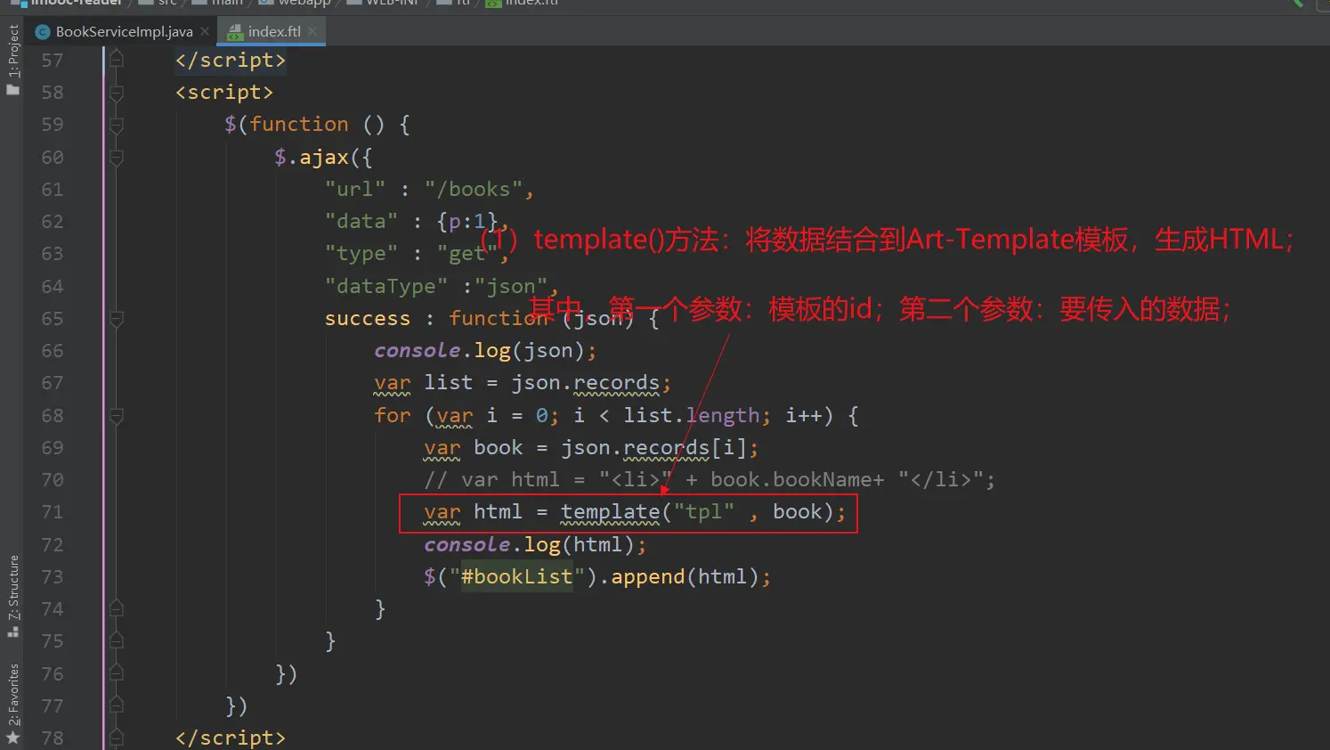 ● 问题: 在【JS模板引擎Art-Template入门】中,我们开发首页时,首页的图书信息,我们是这样做的:【前提,我们首先设置一个<div>容器,把这个容器作为盛放图书信息的容器】→【首先,当后端的图书数据过来后,这些数据是List】→【遍历这些List,每获取一条图书数据,就通过Art-Template定义模板,把这条数据渲成HTML片段】→【然后,把这端HTML,追加到那个容器中】;:为什么在前面显示图书信息这篇博客中,我们这样做;而,在这儿,我们显示短评信息时,我们直接<#list>遍历显示就行了?