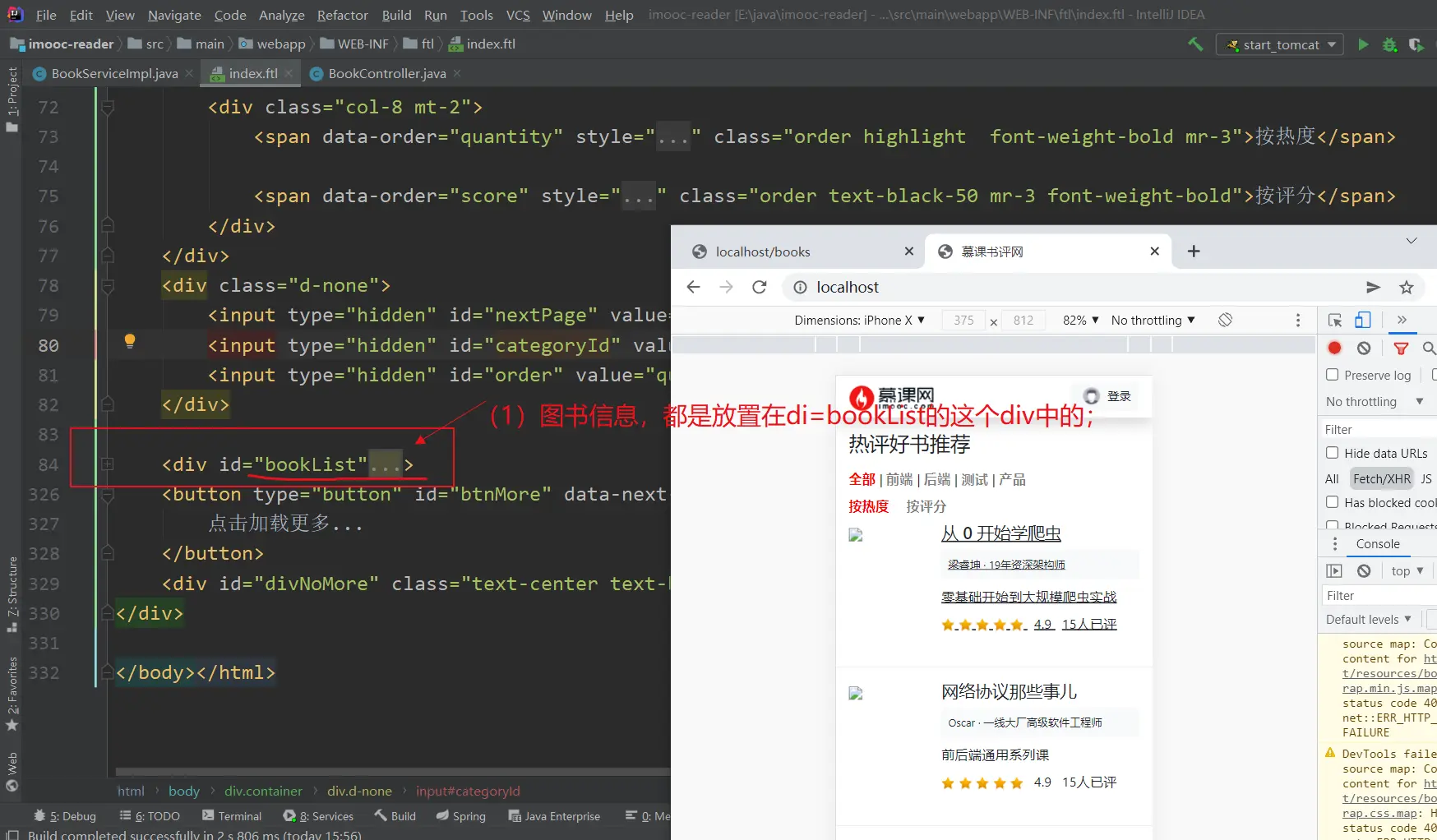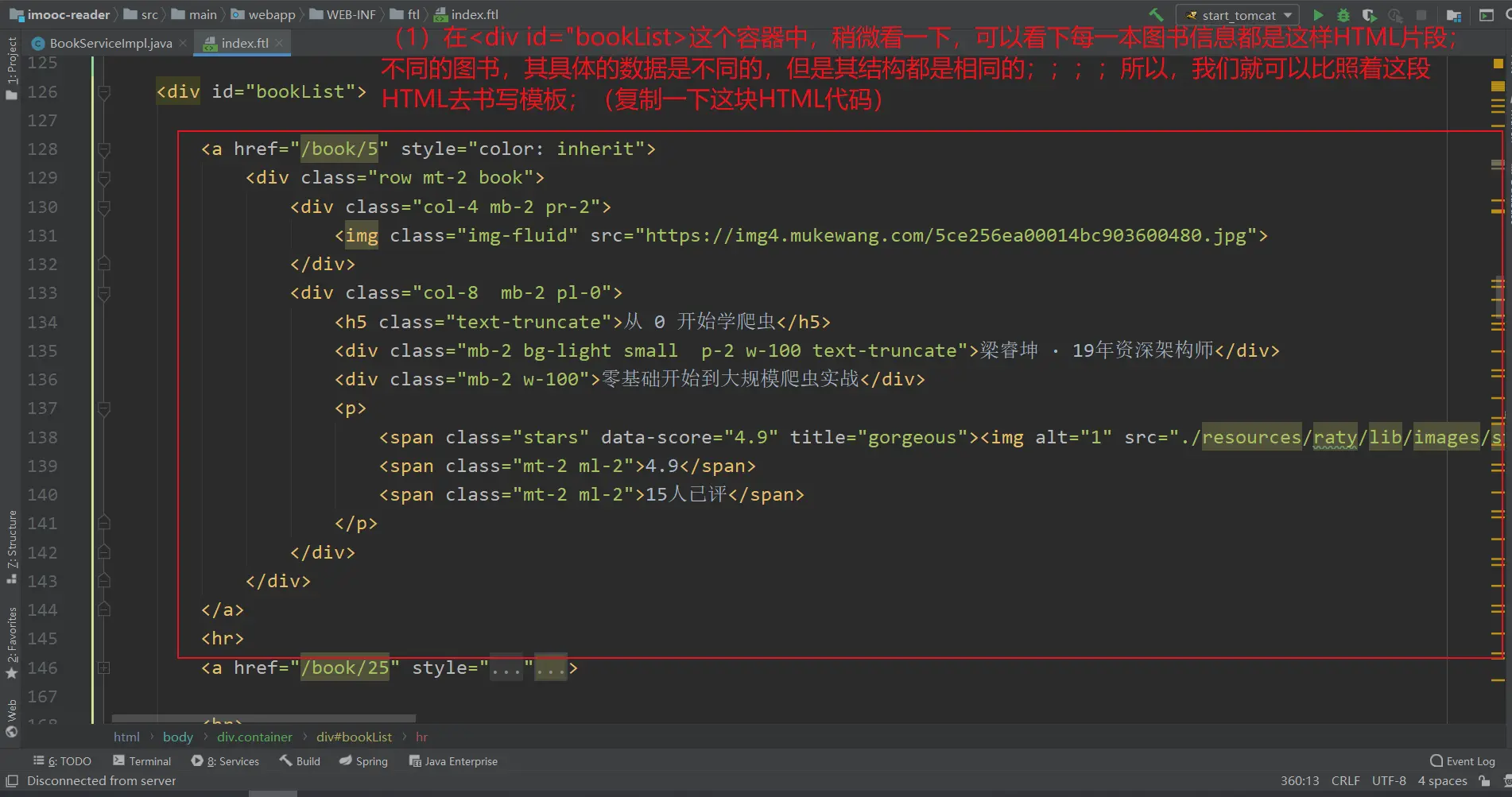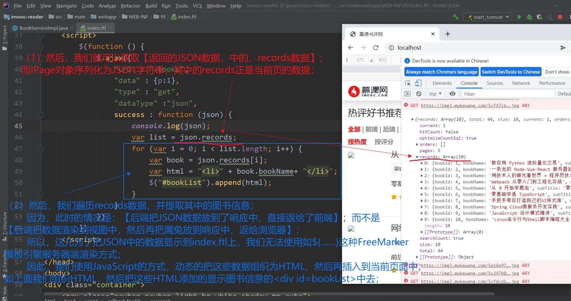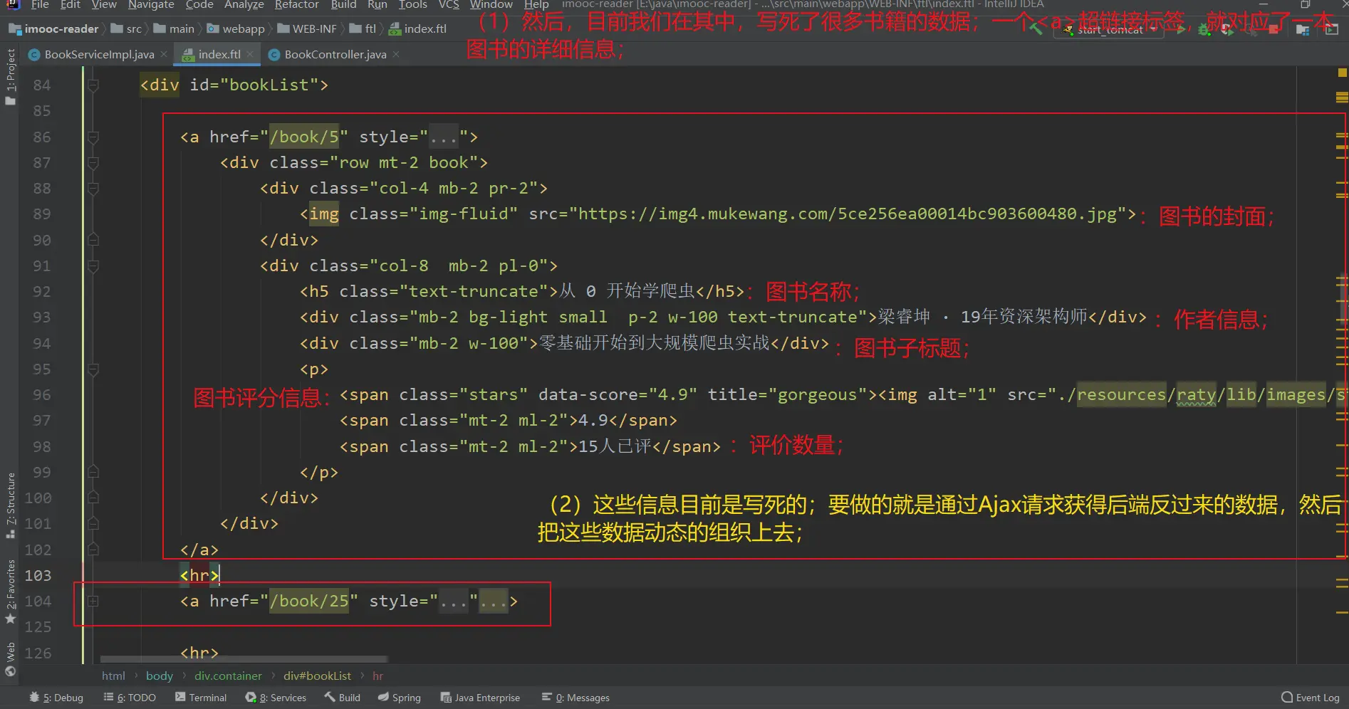 ● 问题: 在【JS模板引擎Art-Template入门】中,我们开发首页时,首页的图书信息,我们是这样做的:【前提,我们首先设置一个<div>容器,把这个容器作为盛放图书信息的容器】→【首先,当后端的图书数据过来后,这些数据是List】→【遍历这些List,每获取一条图书数据,就通过Art-Template定义模板,把这条数据渲成HTML片段】→【然后,把这端HTML,追加到那个容器中】;:为什么在前面显示图书信息这篇博客中,我们这样做;而,在这儿,我们显示短评信息时,我们直接<#list>遍历显示就行了?