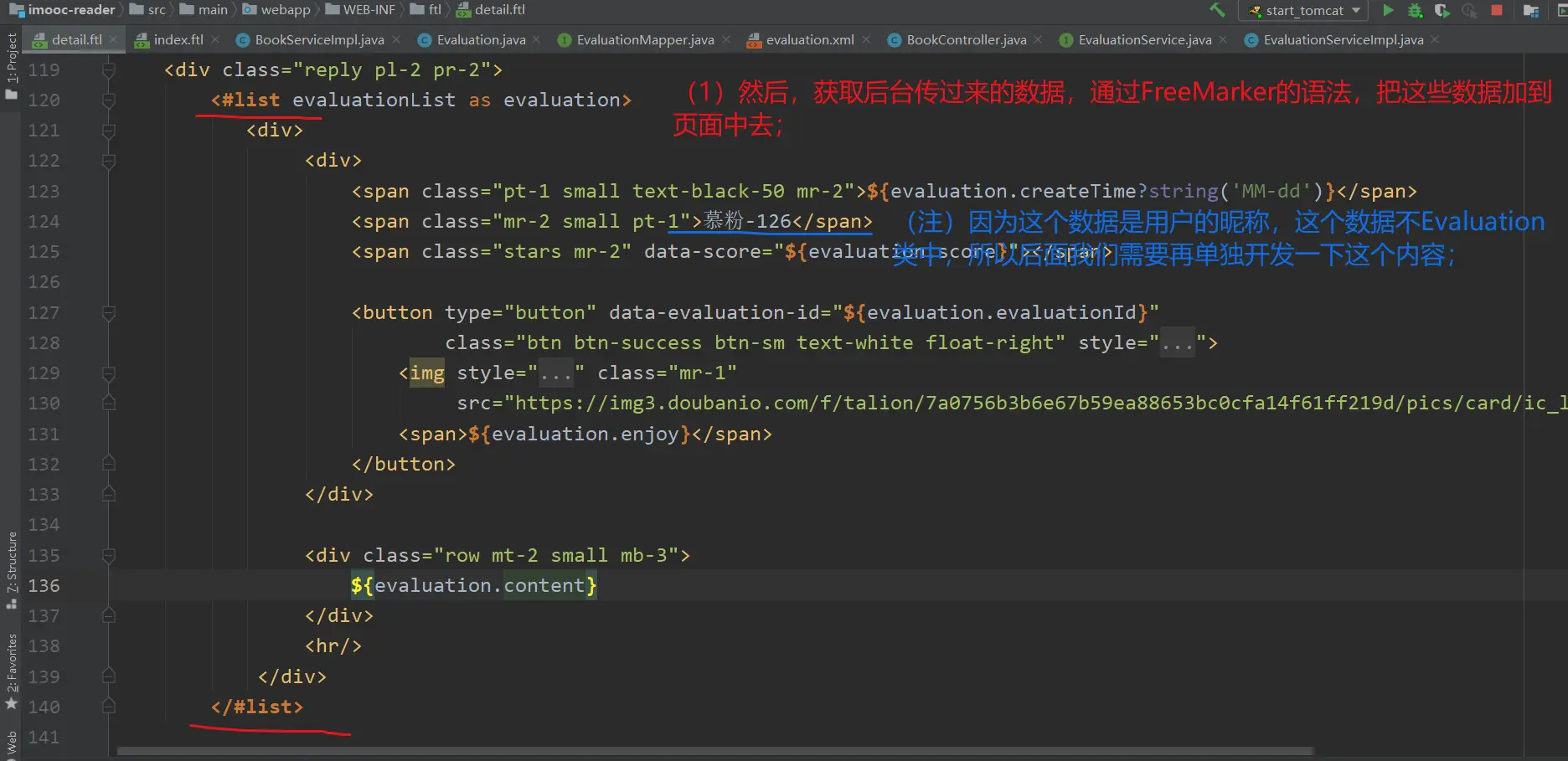 6.2.detail.ftl前端文件,获取短评数据:其实是,获取短评数据的会员昵称;(遇到了 Mybatis-Plus的【@TableField(exist = false),这可以让如Evaluation对象去承载evaluation表中没有对应字段的属性;:新知识,比较重要!!! )