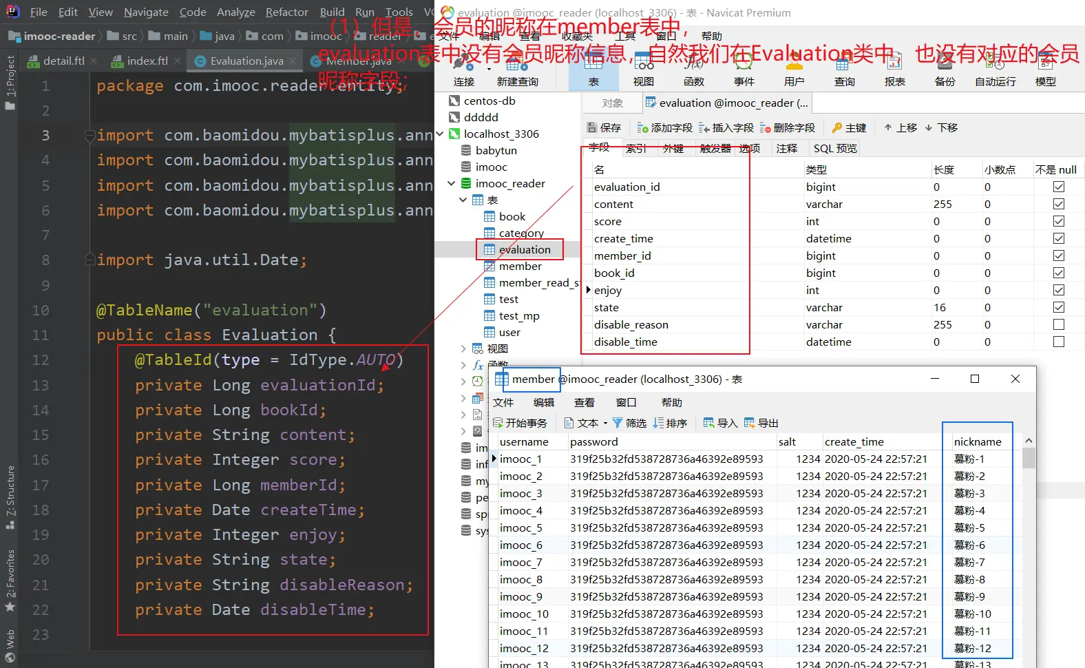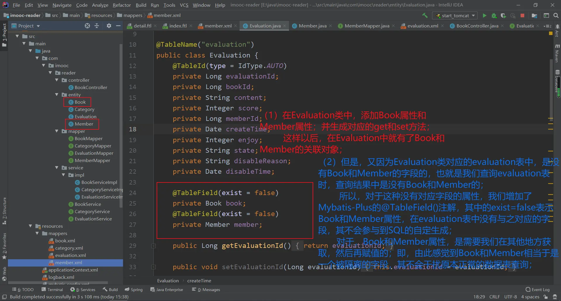 (3)利用Mybatis-Plus的【@TableField(exist = false),在Evaluation中添加Member属性;