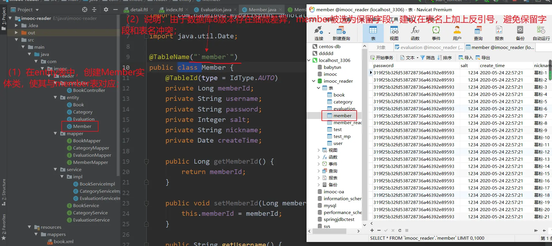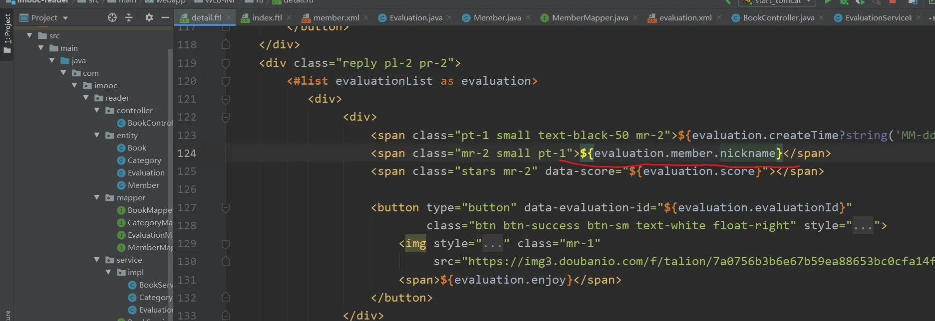 这样以后,每一条短评Evaluation对象,其Book属性和Member属性就有了正确的值,我们在detail.ftl中就能获取到该条短评的对应的会员的昵称了;