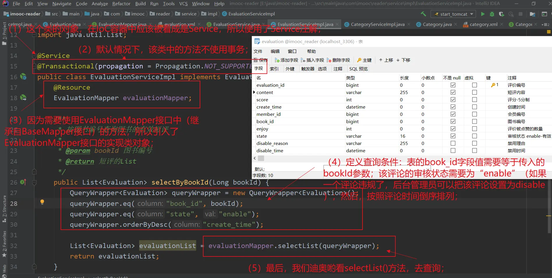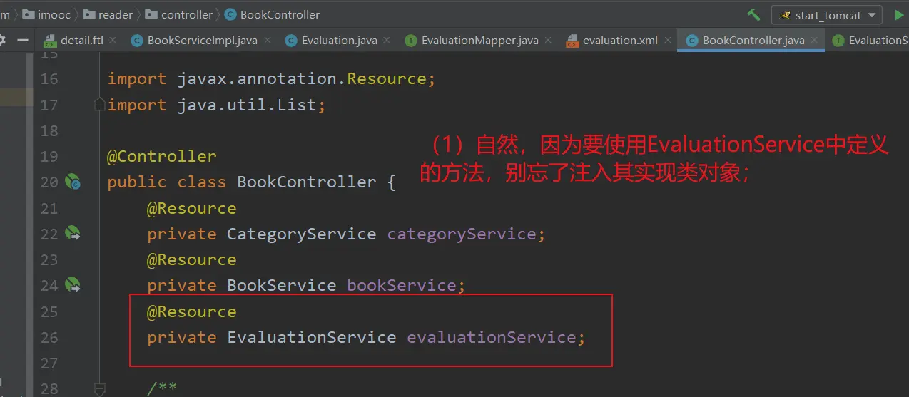 然后,我们就能在EvaluationServiceImpl类中,分别调用【操作book表的Dao】和【操作member表的Dao】,以获取【Book对象】和【Member对象】,然后把这两个对象在赋值为Evaluation对象;