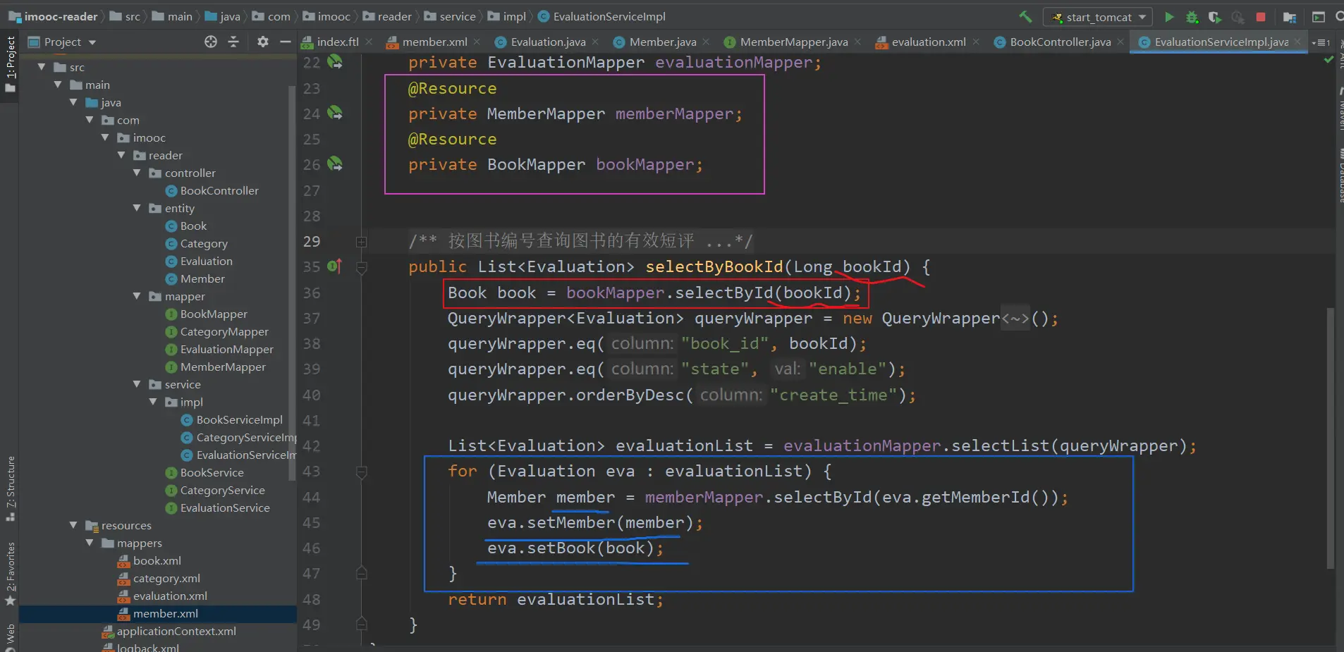 (4) 在EvaluationServiceImpl中,调用member的Dao层代码,以给Evaluation的Member属性赋值;