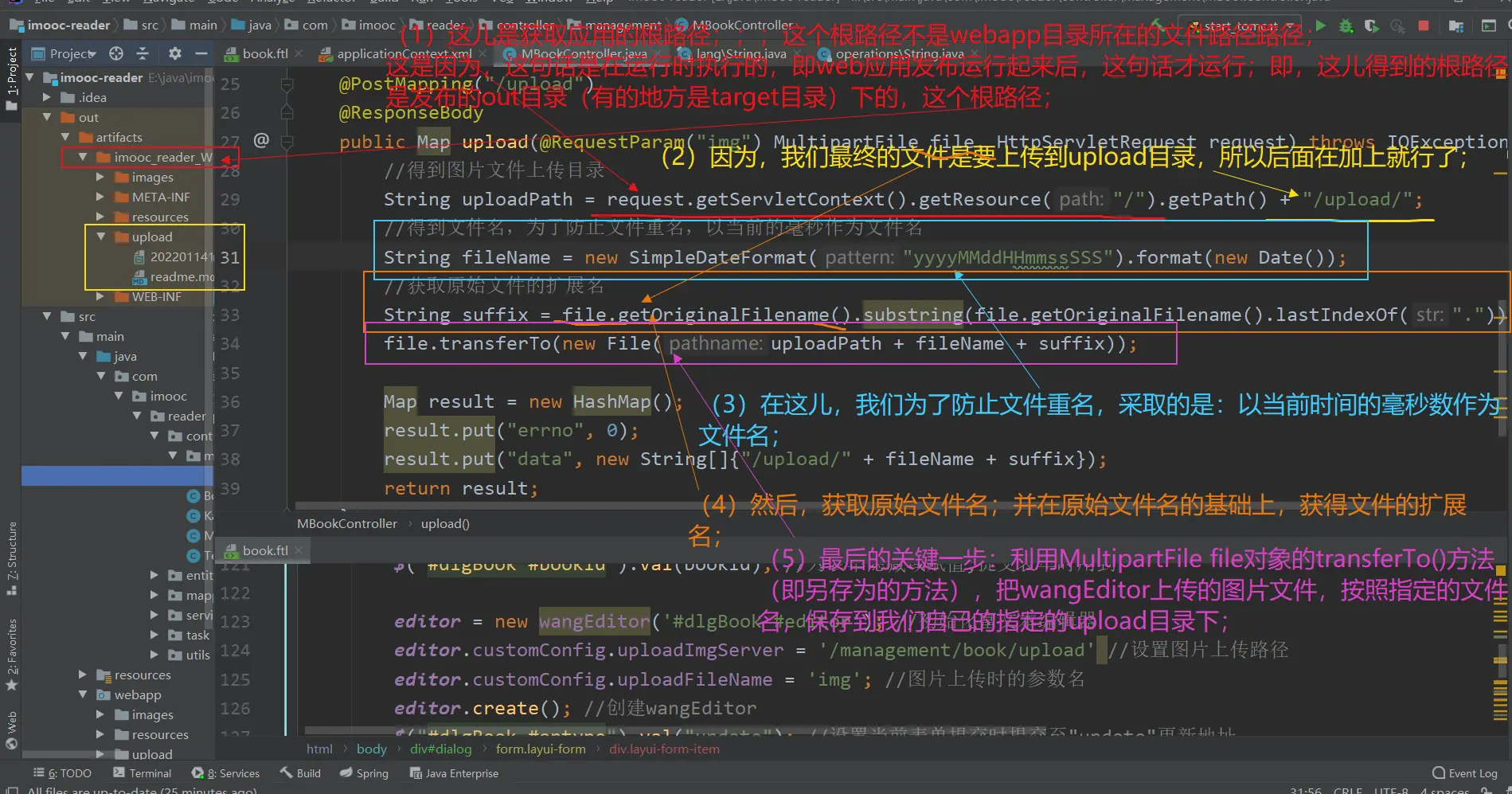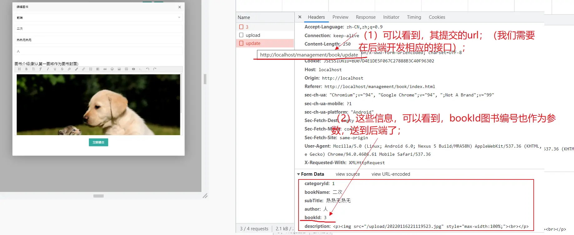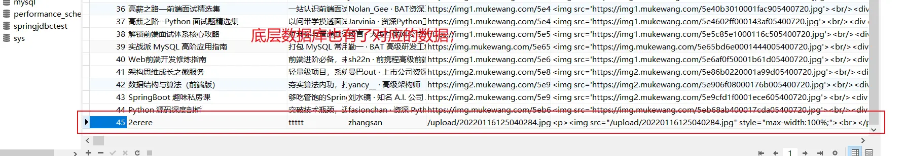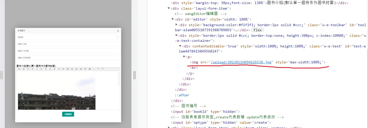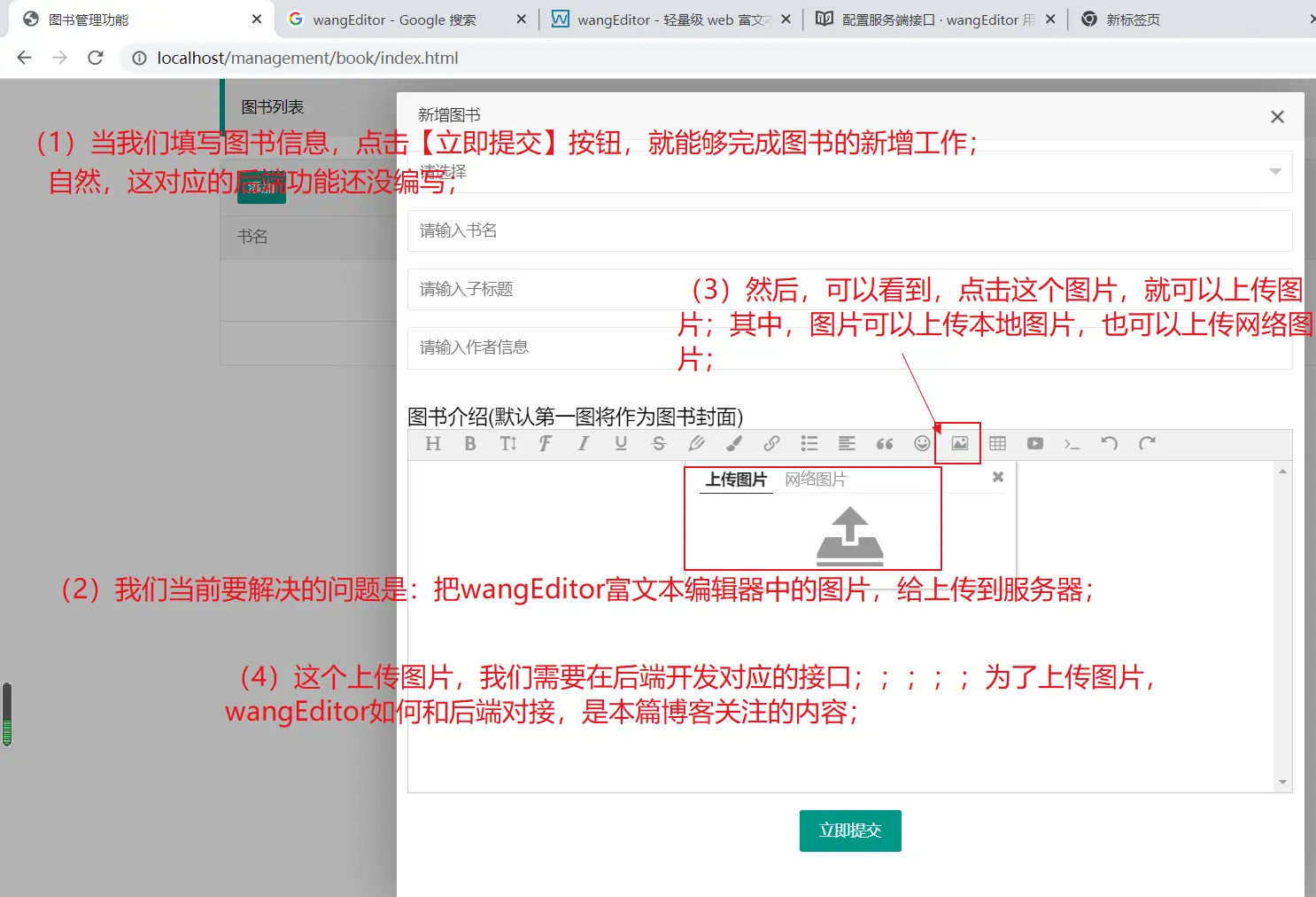 (1) 本篇博客内容说明:【在后台系统,我们点击新增按钮后,会弹出新增图书对话框】→【该对话框中,包含一个wangEditor富文本编辑器】→【wangEditor富文本编辑器中,可以包含图片】→【我们点击对话框中的“点击提交”按钮后,会把当前图书的信息给提价到服务器】→【不过,本篇博客,只关心如何把wangEditor中的图片上传到服务器;暂不关心图书信息的其他内容】→【完整图书信息提交,的后端逻辑,将在下篇博客中介绍】;