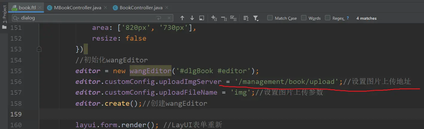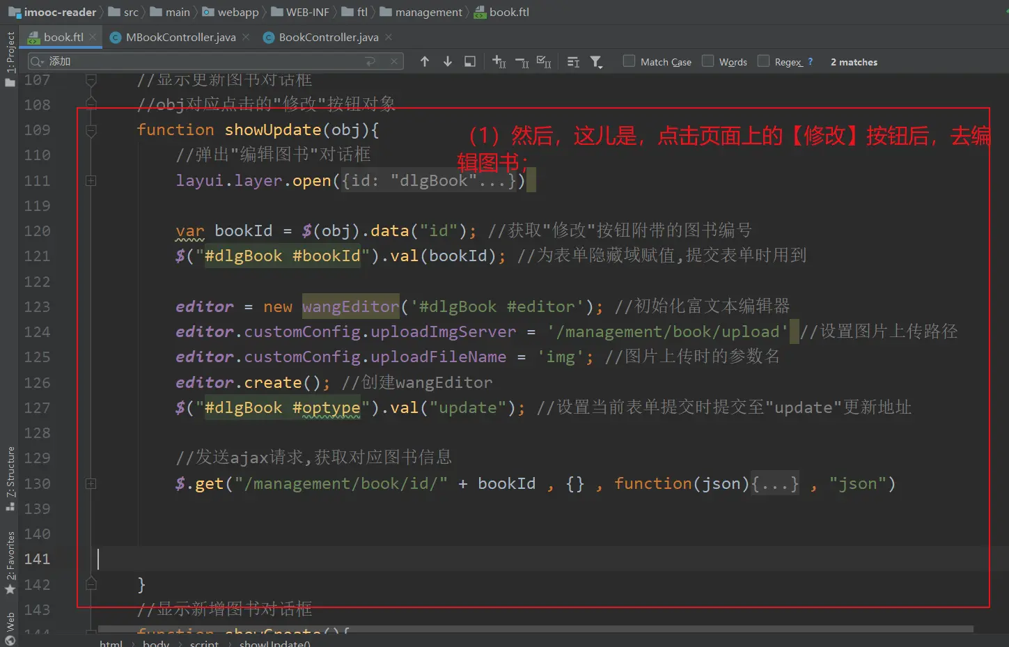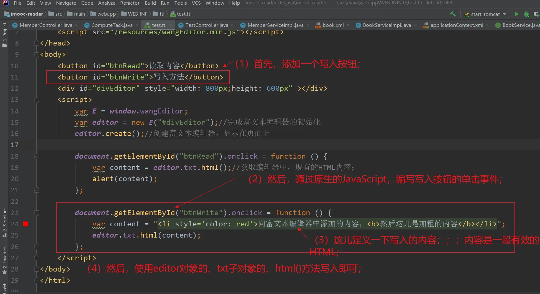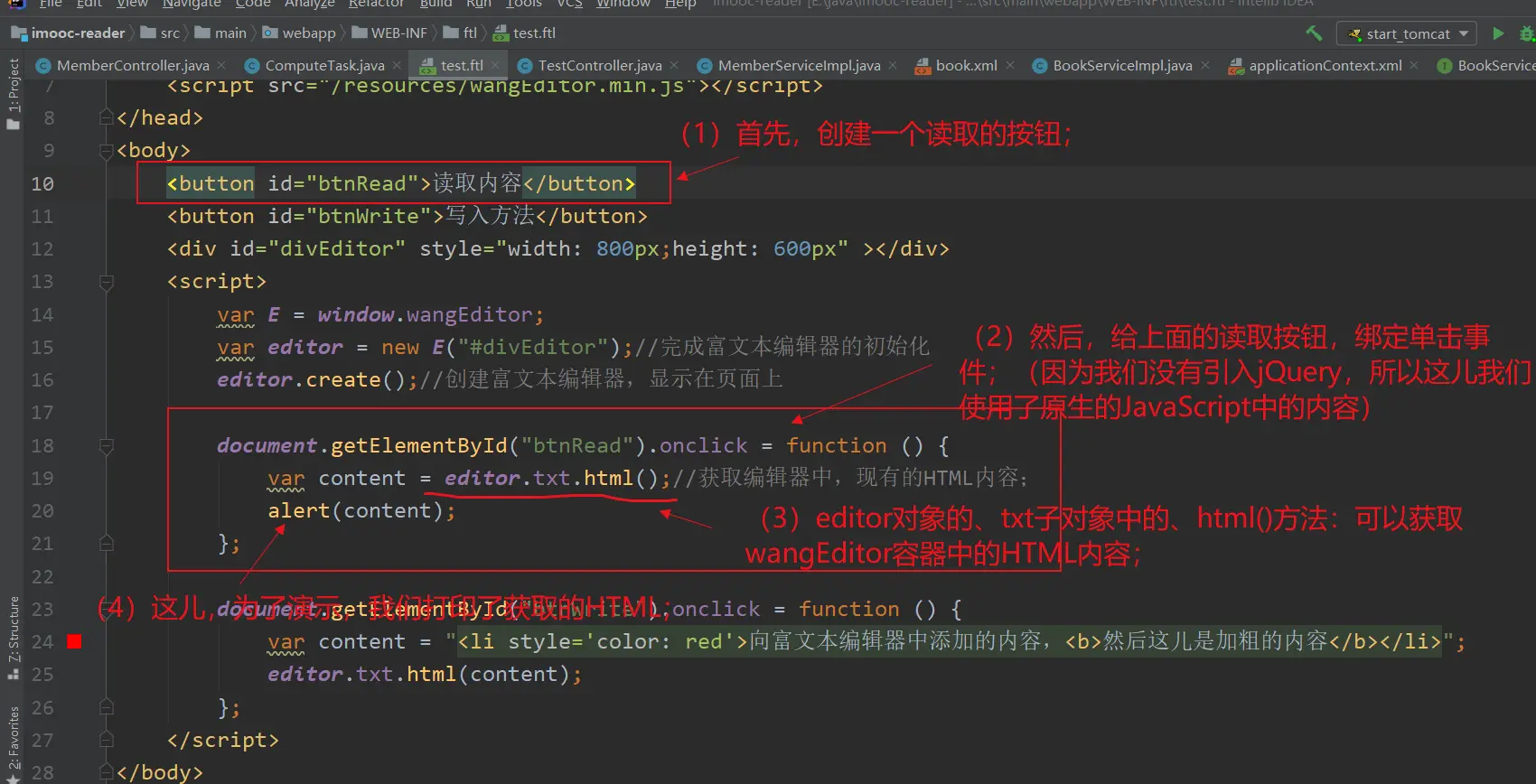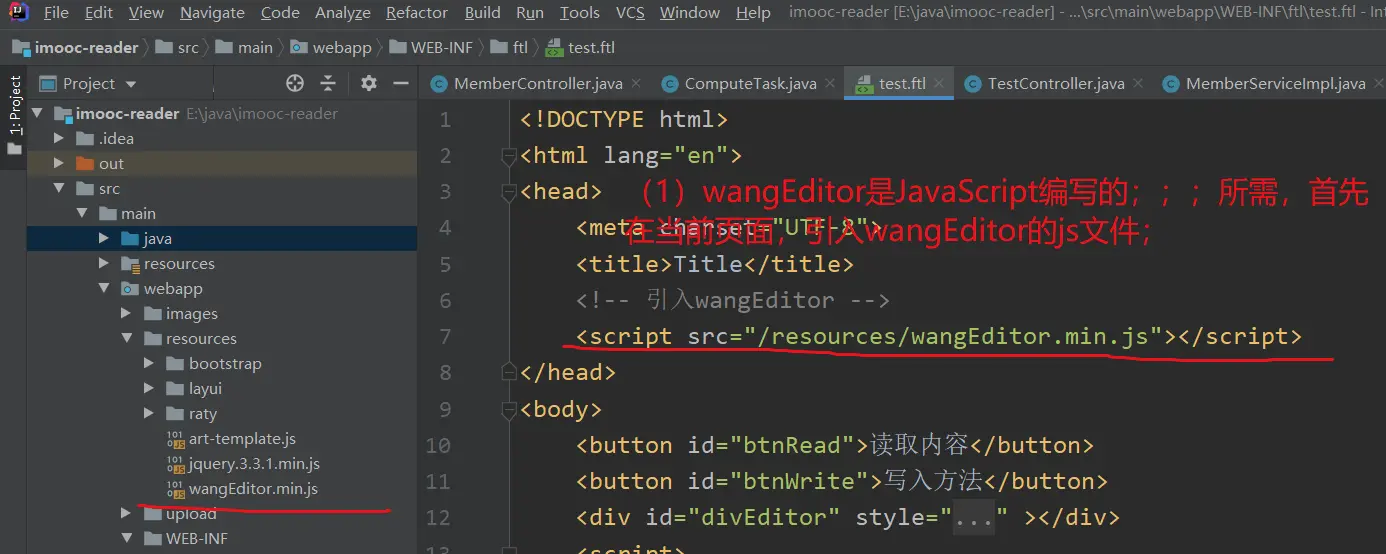 3.在test.ftl中编写wangEditor:包括【wangEditor初始化】,【如何读取内容】,【如何写入内容】;(重点,核心!)