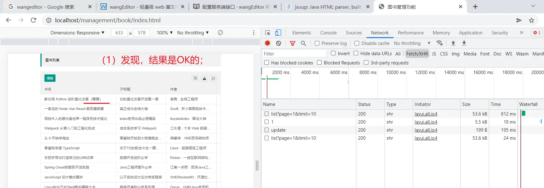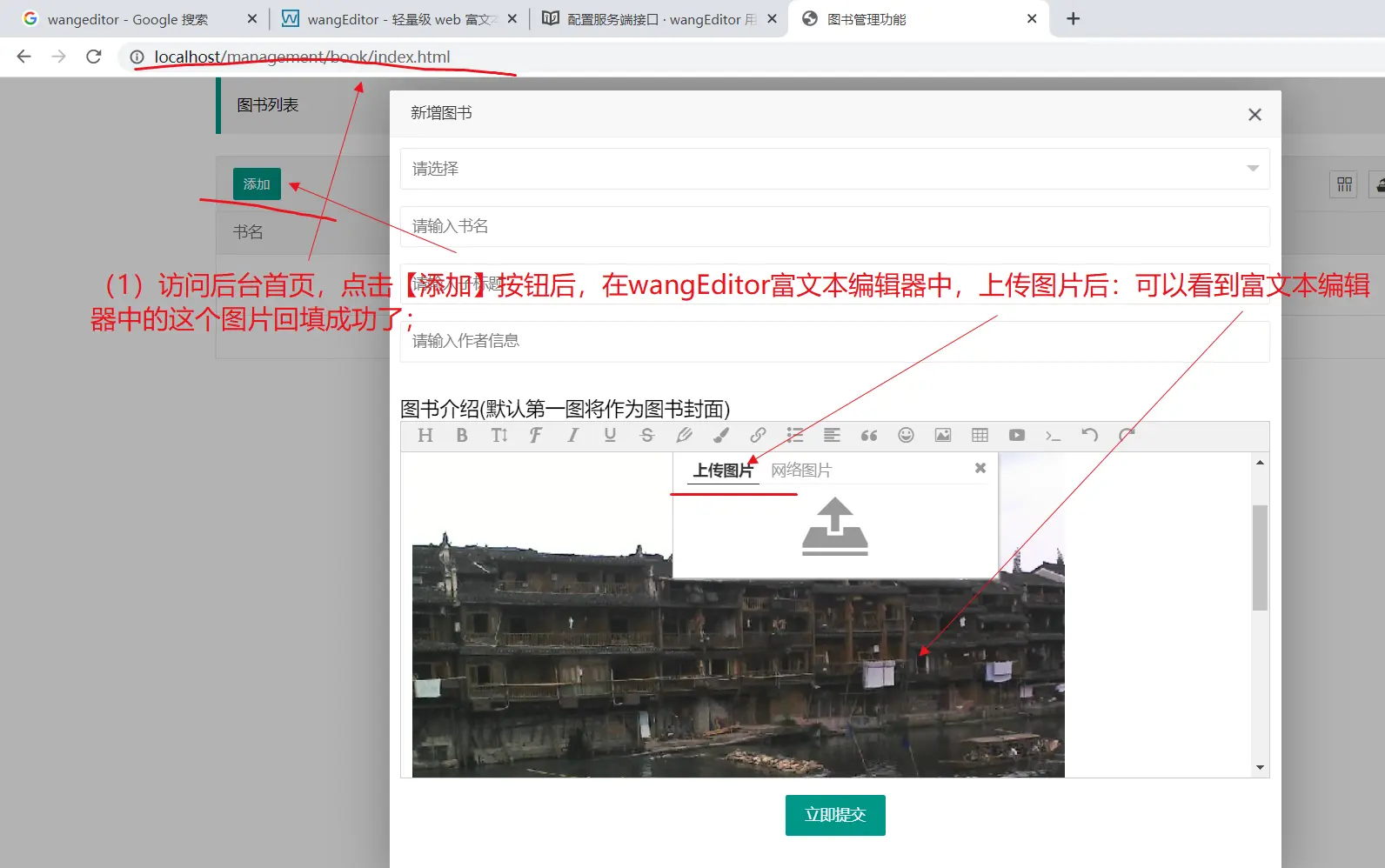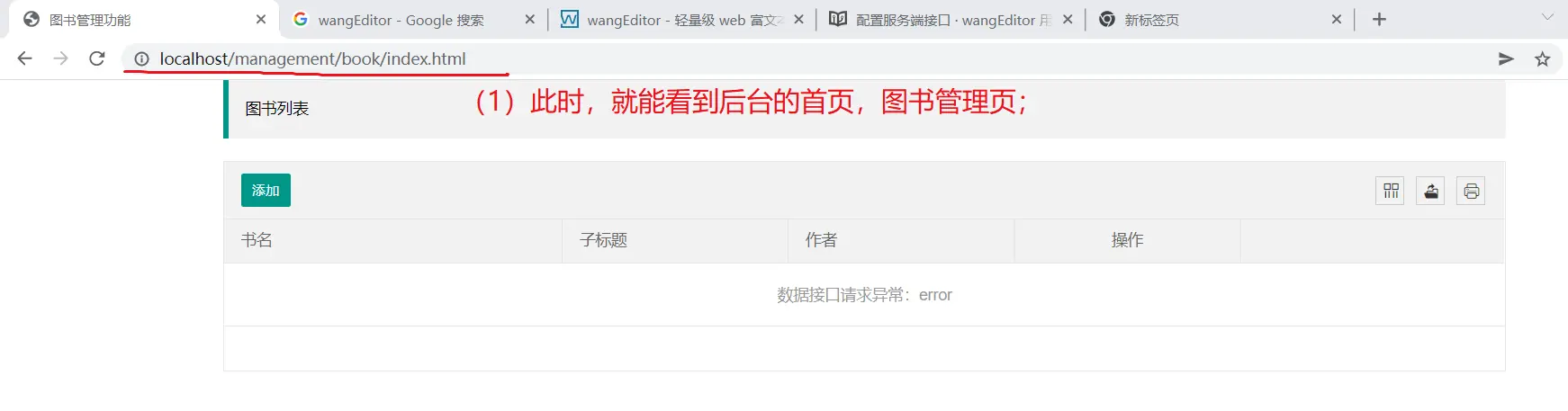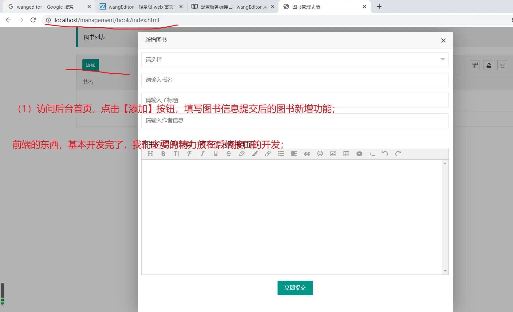 至此,wangEditor的最基本使用就OK了;有了这个基础后,就可以取开发后台的图书管理功能了;