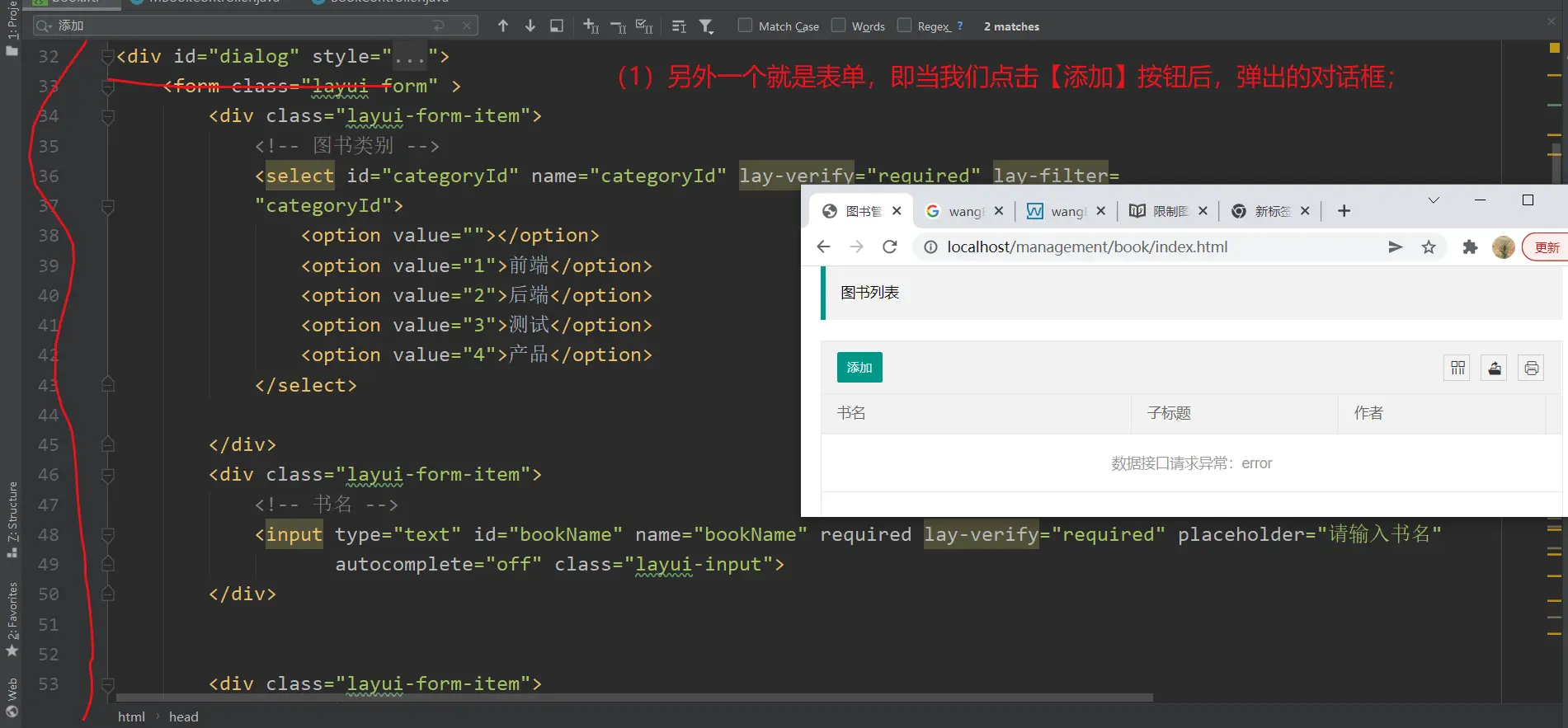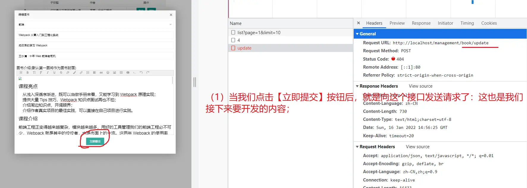在后台管理系统,当我们点击【添加】按钮后,会出现一个【包含wangEditor富文本编辑器的,弹出表单】;当我们点击【立即提交】后,会把图书的信息提交到服务器;