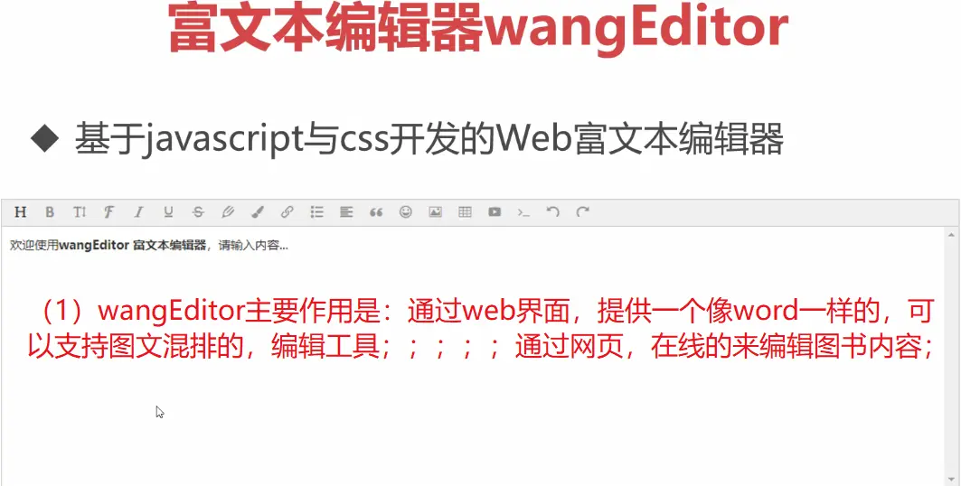 (1) 为什么要介绍wangEditor?:在【项目演示】中,我们演示了书评网;其中,就包括后台管理系统;而后台管理系统,最重要的就是图书资料的管理;然后,在图书资料管理时,如何对图书信息进行有效的图文编辑是重点;为此,引入了一个JavaScript组件:富文本编辑器wangEditor;