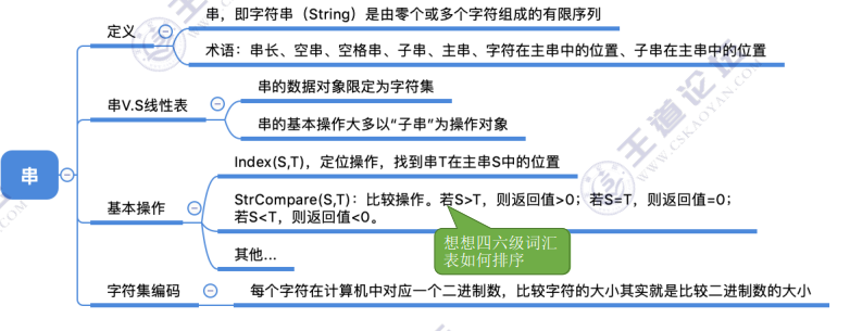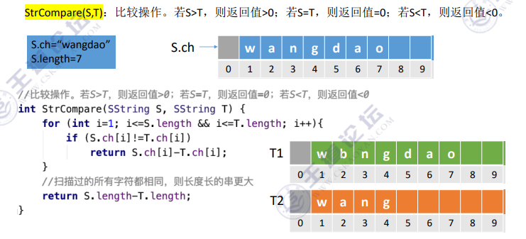 StrCompare (S, T):比较操作。若 S>T,则返回值 > 0;若 S=T,则返回值 = 0;若 S