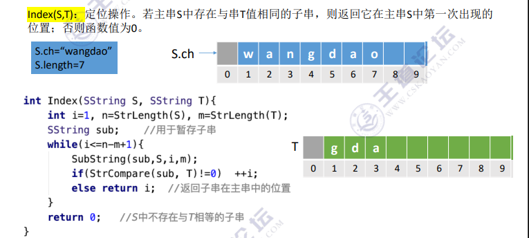 Index (S, T):定位操作。若主串 S 中存在与串 T 值相同的子串,则返回它在主串 S 中第一次出现的位置;否则函数值为 0。