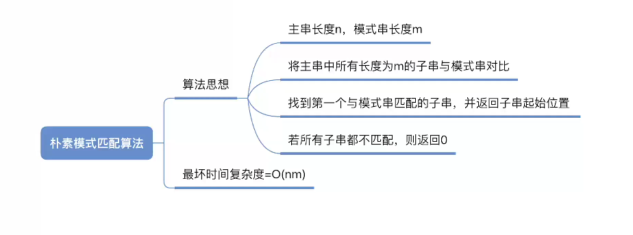 朴素模式匹配算法 :将主串中所有长度为 m 的子串依次与模式串对比,直到找到一个完全匹配的或所有的子串都不匹配为止
