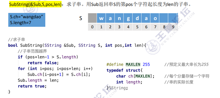SubString (&Sub, S, pos, len):求子串。用 Sub 返回串 S 的第 pos 个字符起长度为 len 的子串。