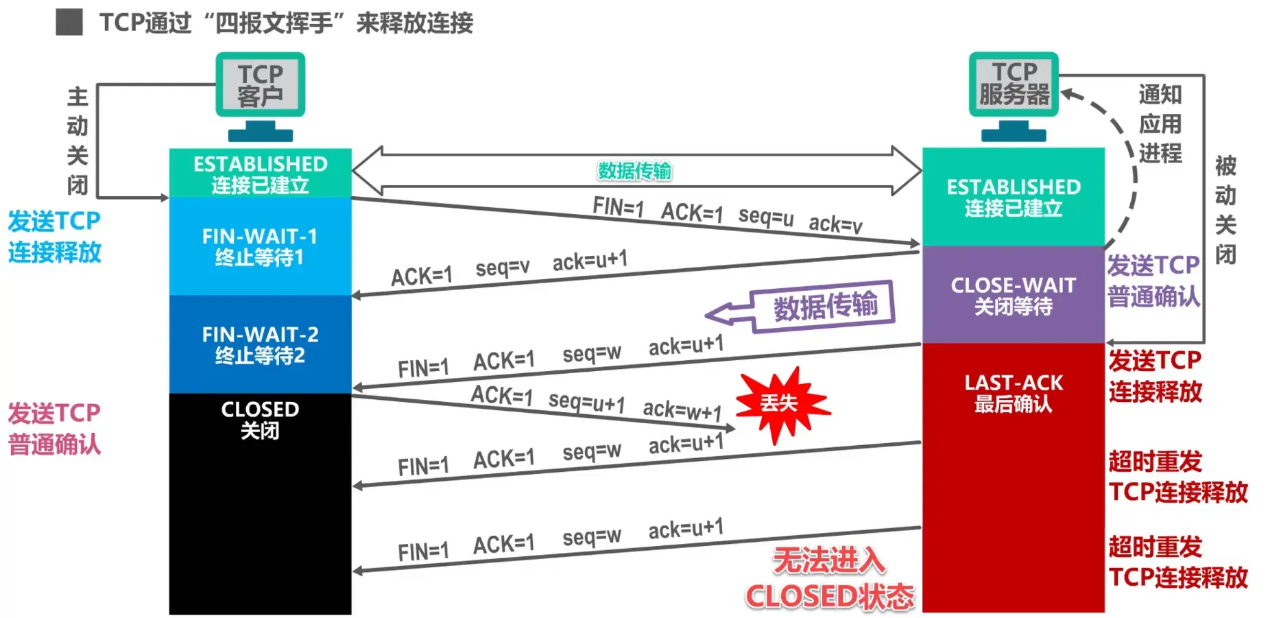 仍处于最后确认状态,重传的tcp连接释放报文段到达tcp客户进程,由于tcp客户进程属于关闭状态,因此不理睬该报文段