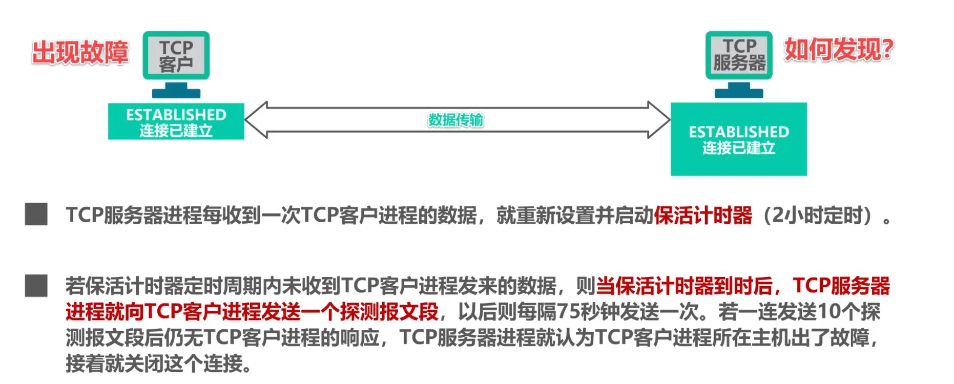 设想这样一种情况tcp双方已经建立了连接,后来tcp客户进程所在的主机,突然出现了故障。显然tcp服务器进程以后就不能再收到tcp客户进程发来的数据,因此应当有措施,使tcp服务器进程不要再白白等待下去。换句话说tcp服务器进程应该如何发现这种情况呢?