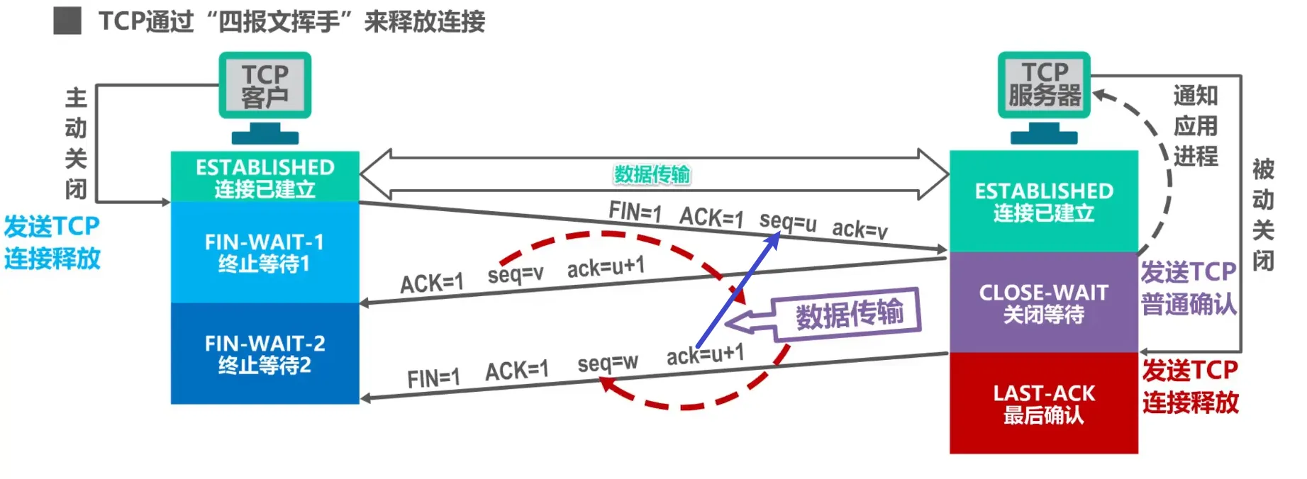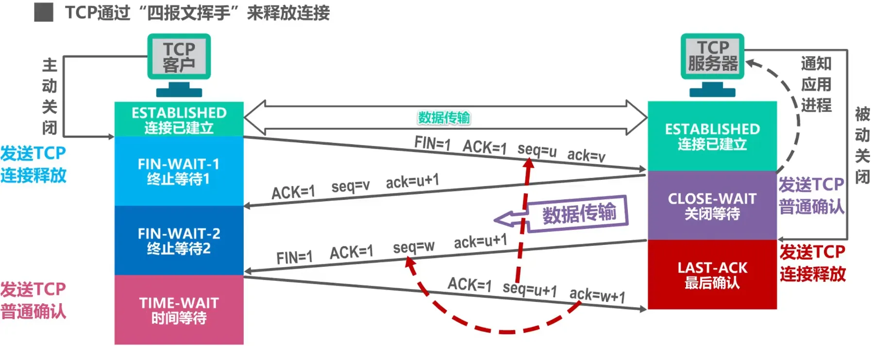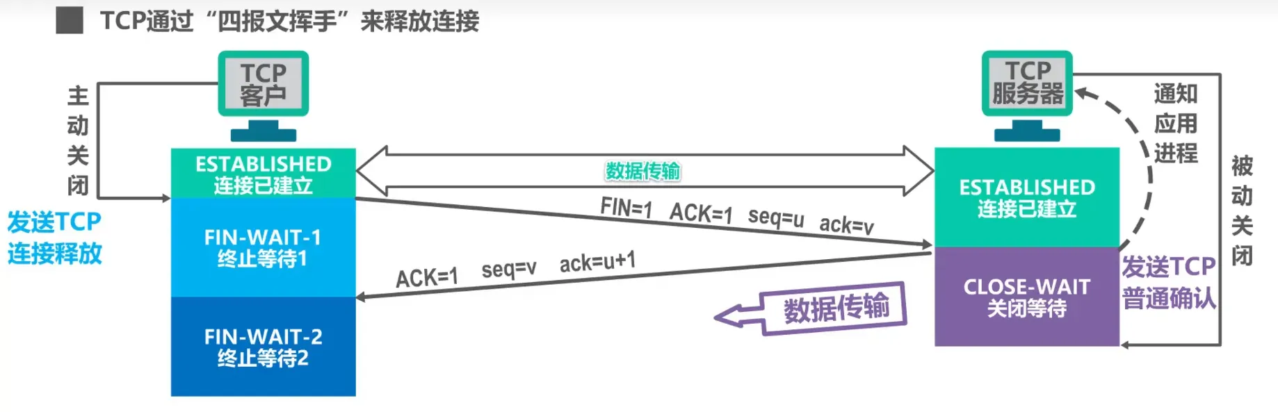 数据传输结束后,tcp通信双方都可以释放连接,现在tcp客户进程和tcp服务器进程都处于连接已建立状态