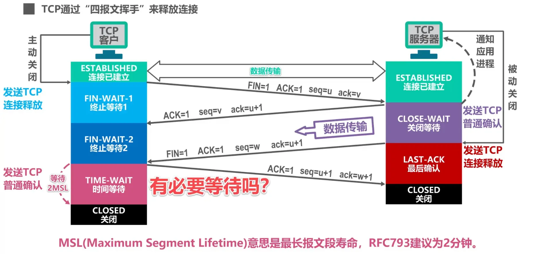 而tcp客户进程还要经过两倍的msl后才能进入关闭状态,msl的意思是最长报文段寿命